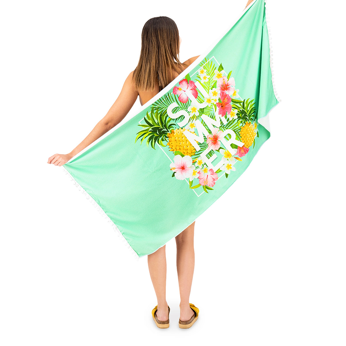✅ Toalla de microfibra multicolor con print summer, detalle de pompones en las orillas, ligera y suave lo que permite un doblado compacto. Diferentes usos como: toalla de playa, tolla de baño, manta de picnic, etc.