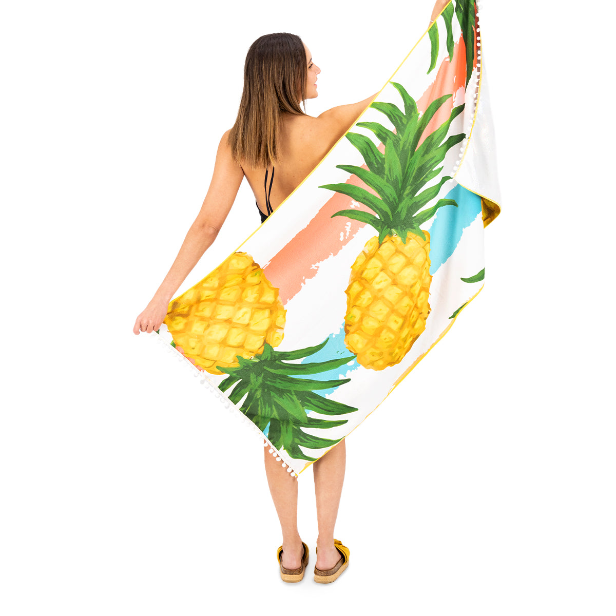 ✅ Toalla de microfibra multicolor con print de piñas, detalle de pompones en los extremos, ligera y suave lo que permite un doblado compacto. Diferentes usos como: toalla de playa, tolla de baño, manta de picnic, etc.