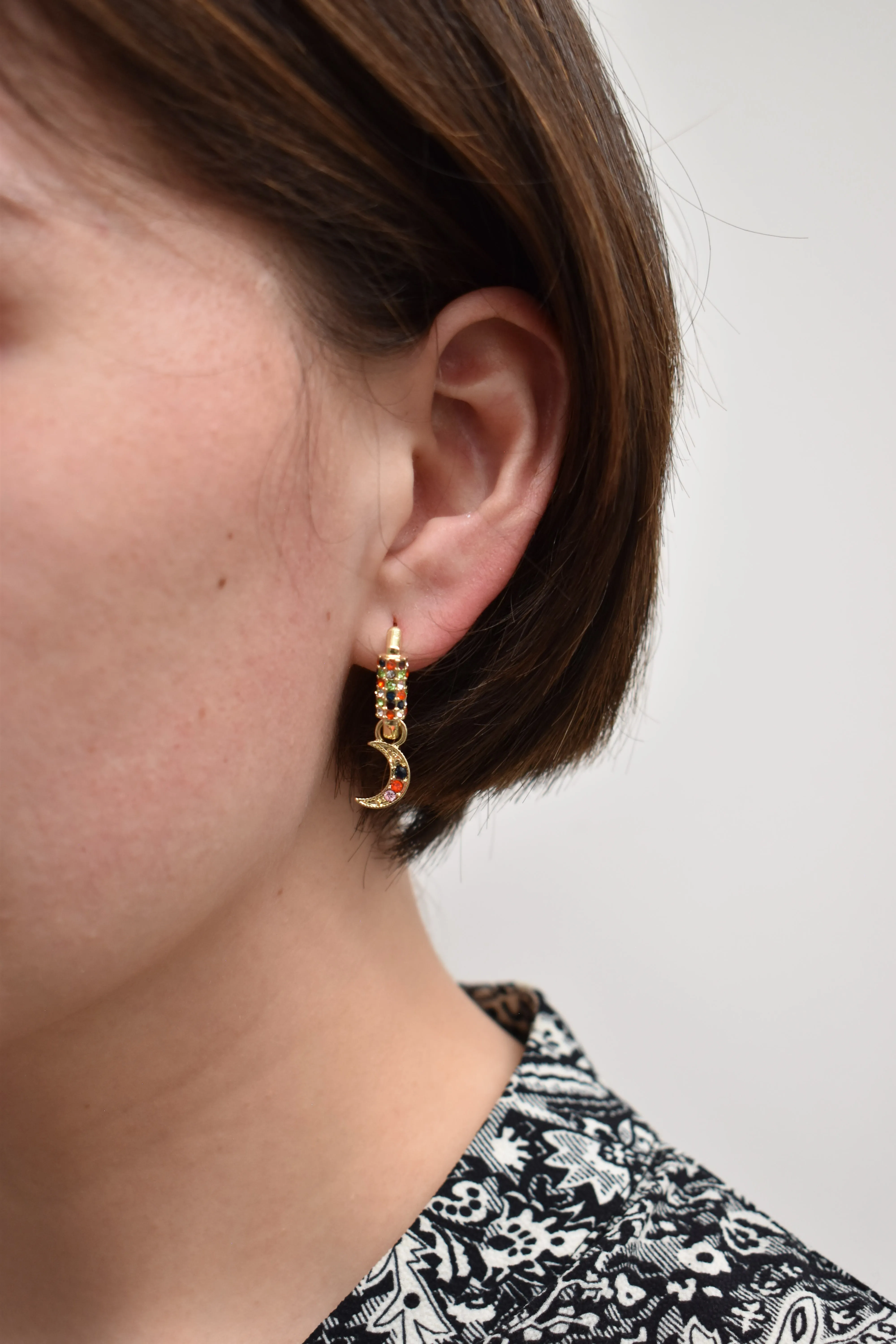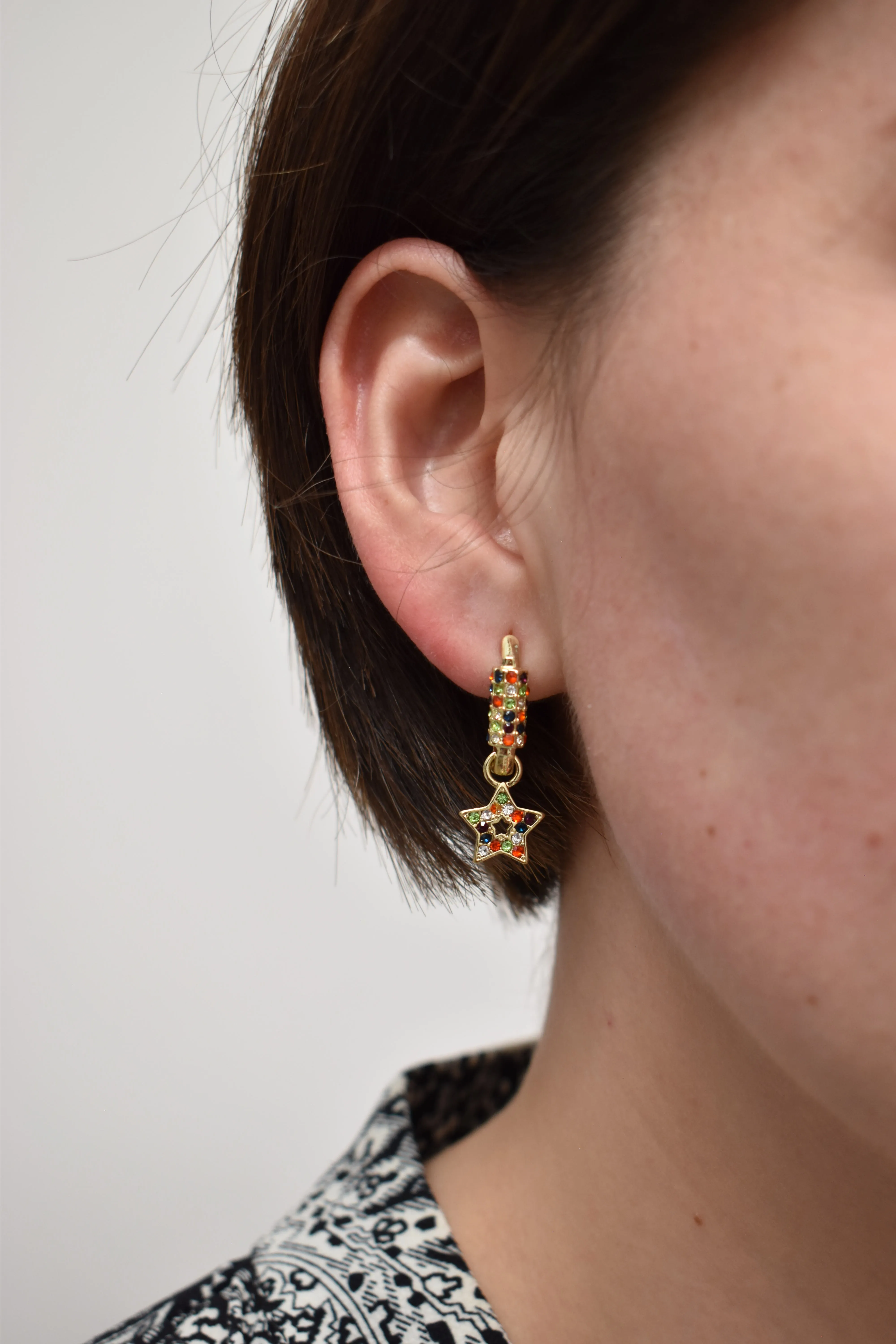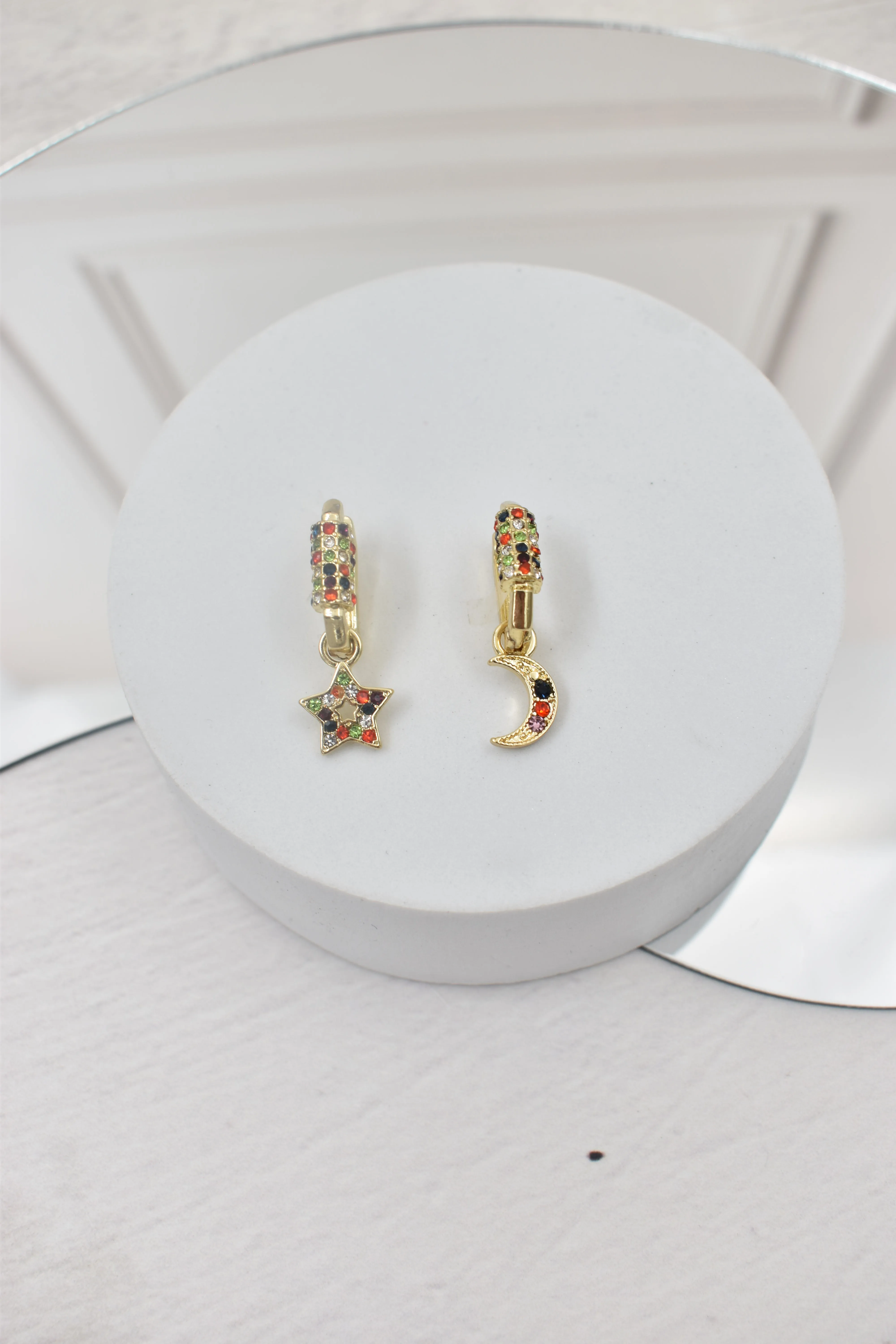 1 par de aretes color dorado, detalle en pedrería multicolor texturizado, dijes colgantes en forma de estrella y luna con pedrería ideal para uso diario, cómodos y resistentes. Medida: 2.5 cm ancho x 4 cm largo Composición: 90% hierro 10% zinc Instrucciones de cuidado: Limpiar con paño seco.