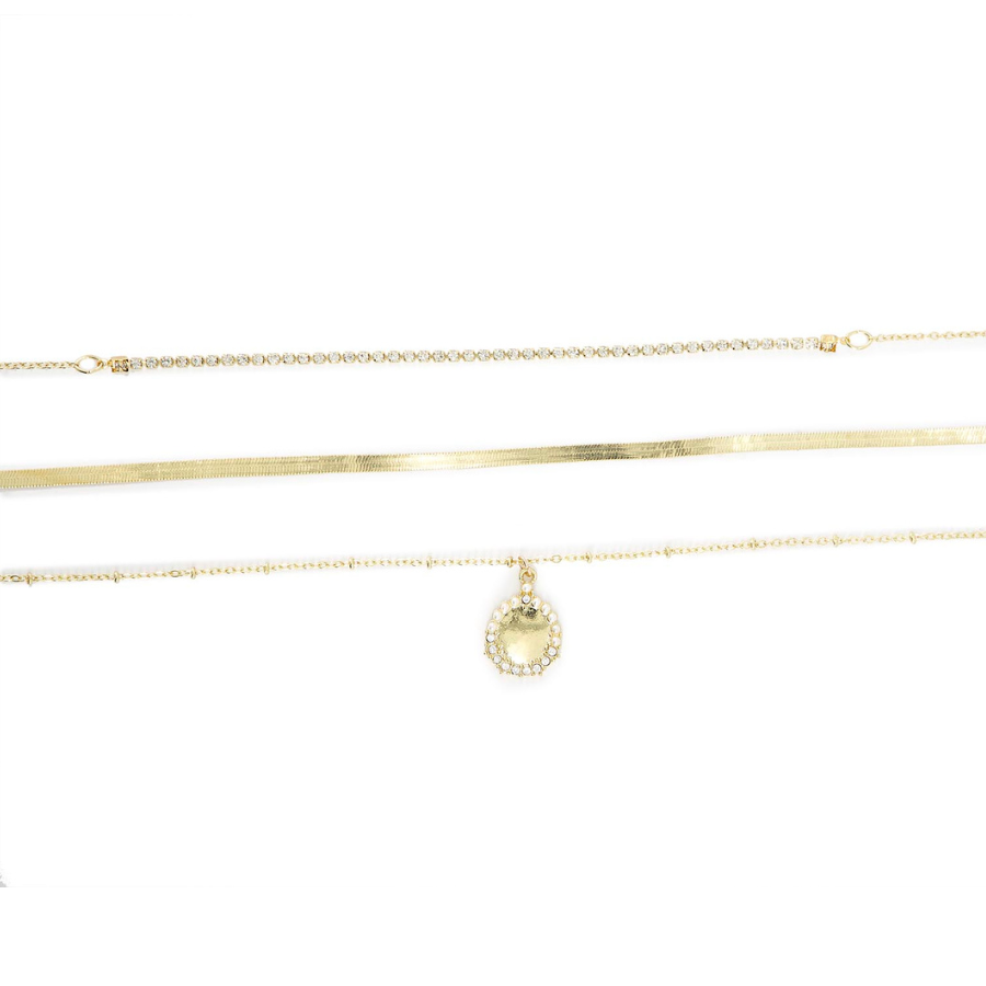 Set de 3 collares color dorado, 1 collar liso, 1 collar con pedrería y 1 collar con dije colgante, diferentes diseños y texturas, ideal para uso diario, cómodos y resistentes. Color: Dorado Medidas: Collar liso: 5 mm x 31 cm largo Collar dije con perlas: 34 cm largo (contando el dije) Collar con pedrería: 30 cm largo Composición: cobre, hierro, acero y perlas Instrucciones de cuidado: Limpiar con paño seco.