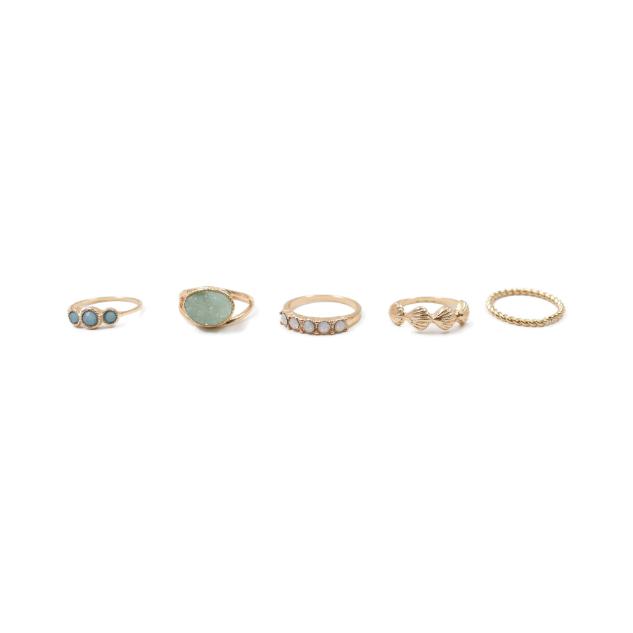 5 anillos color dorado, detalle en pedrería jade multicolor (verde, blanca, azul) diferentes diseños y texturas, ideal para uso diario, cómodos y resistentes. Colores y medidas: Talla: 7.5 Composición: 70% zinc, 20% resina, 10% metal Instrucciones de cuidado: Limpiar con paño seco.