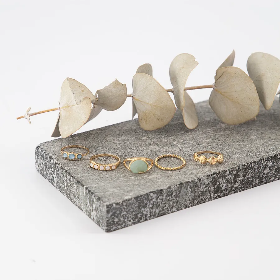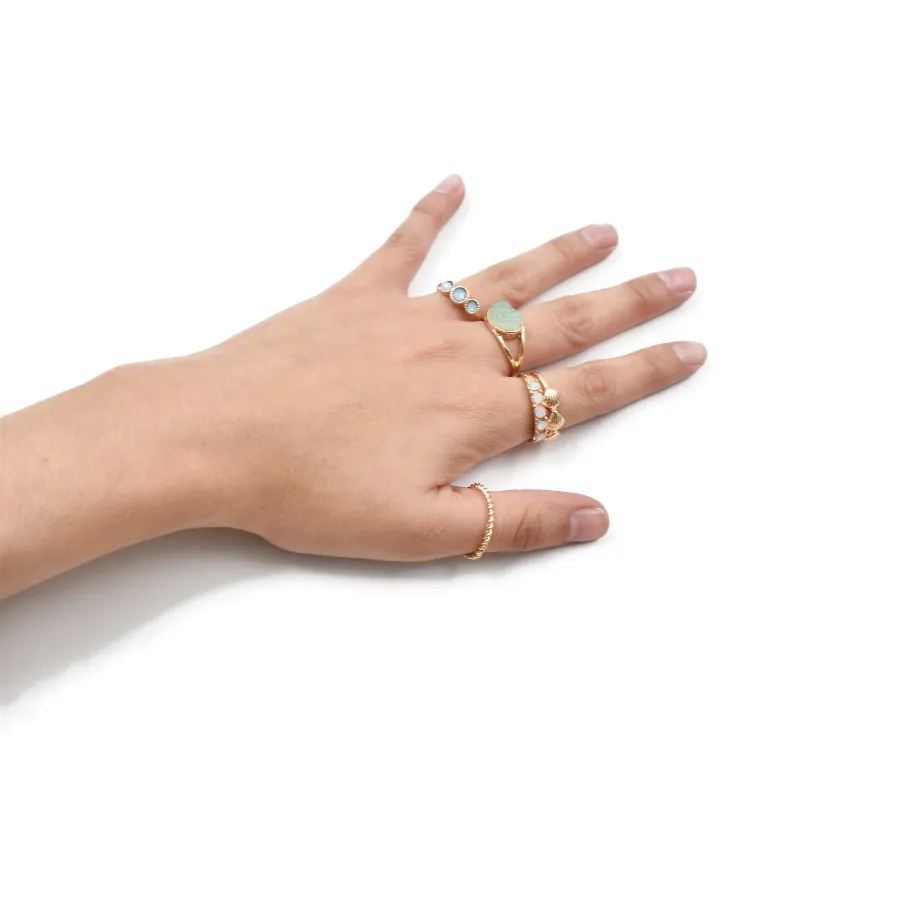 5 anillos color dorado, detalle en pedrería jade multicolor (verde, blanca, azul) diferentes diseños y texturas, ideal para uso diario, cómodos y resistentes. Colores y medidas: Talla: 7.5 Composición: 70% zinc, 20% resina, 10% metal Instrucciones de cuidado: Limpiar con paño seco.