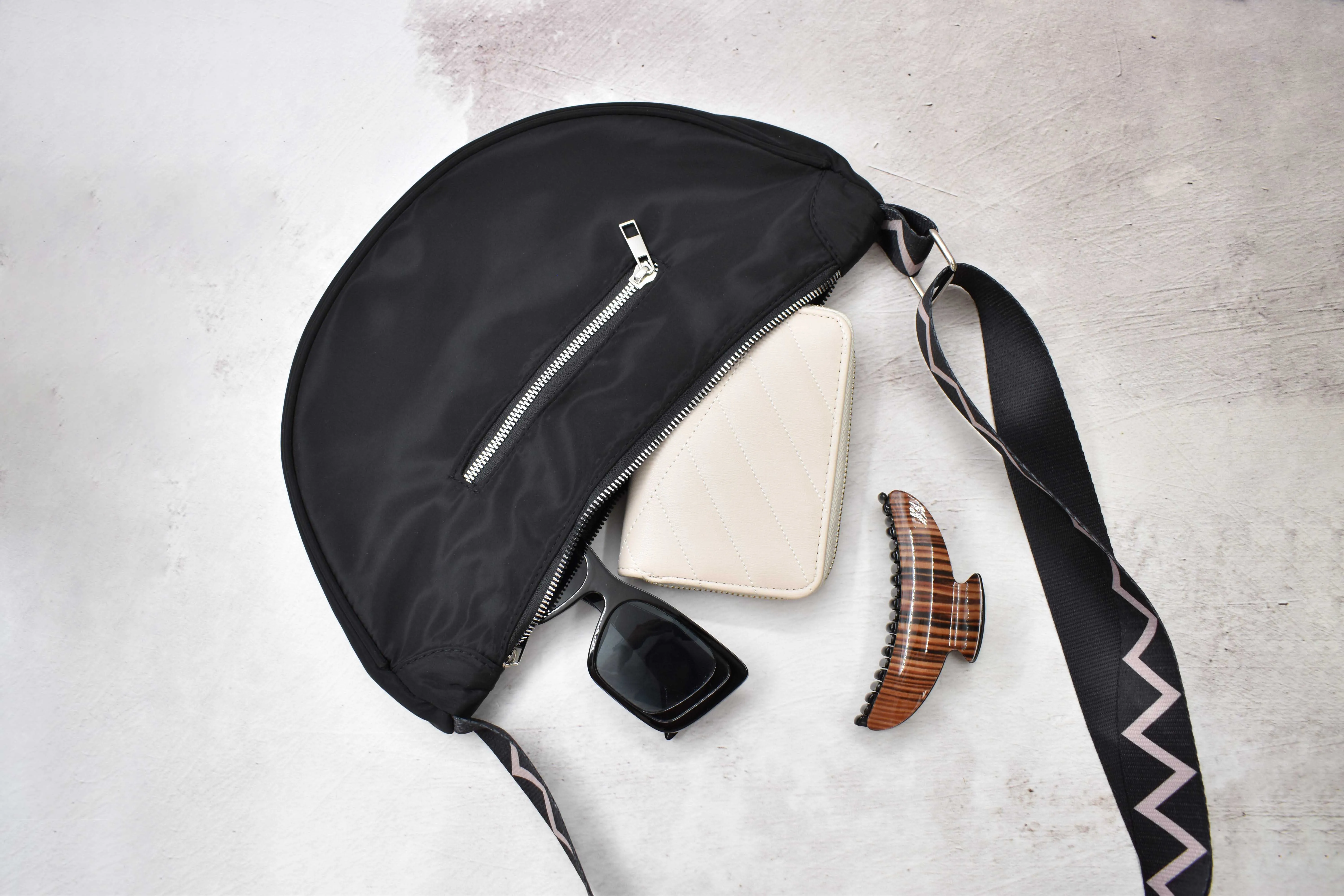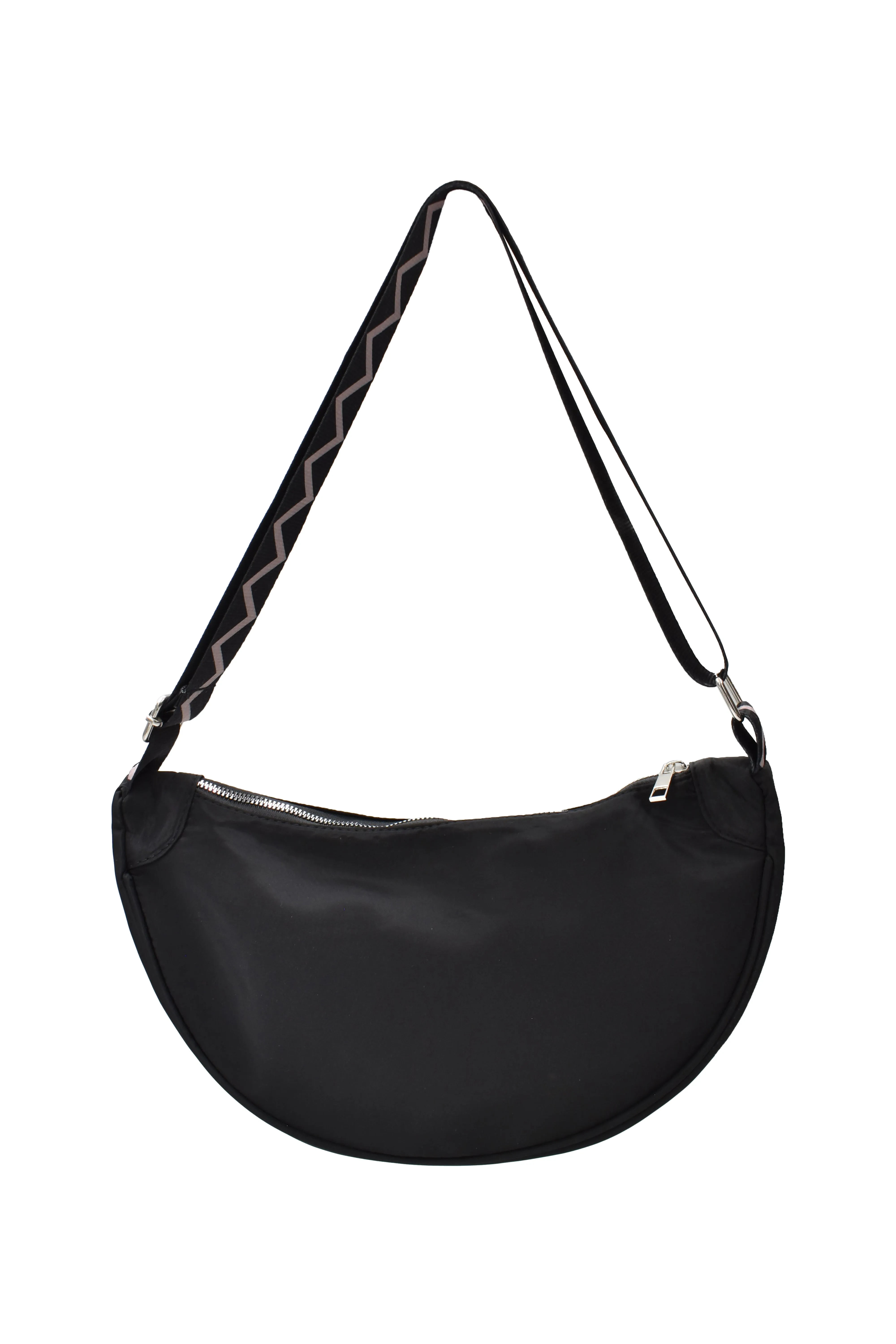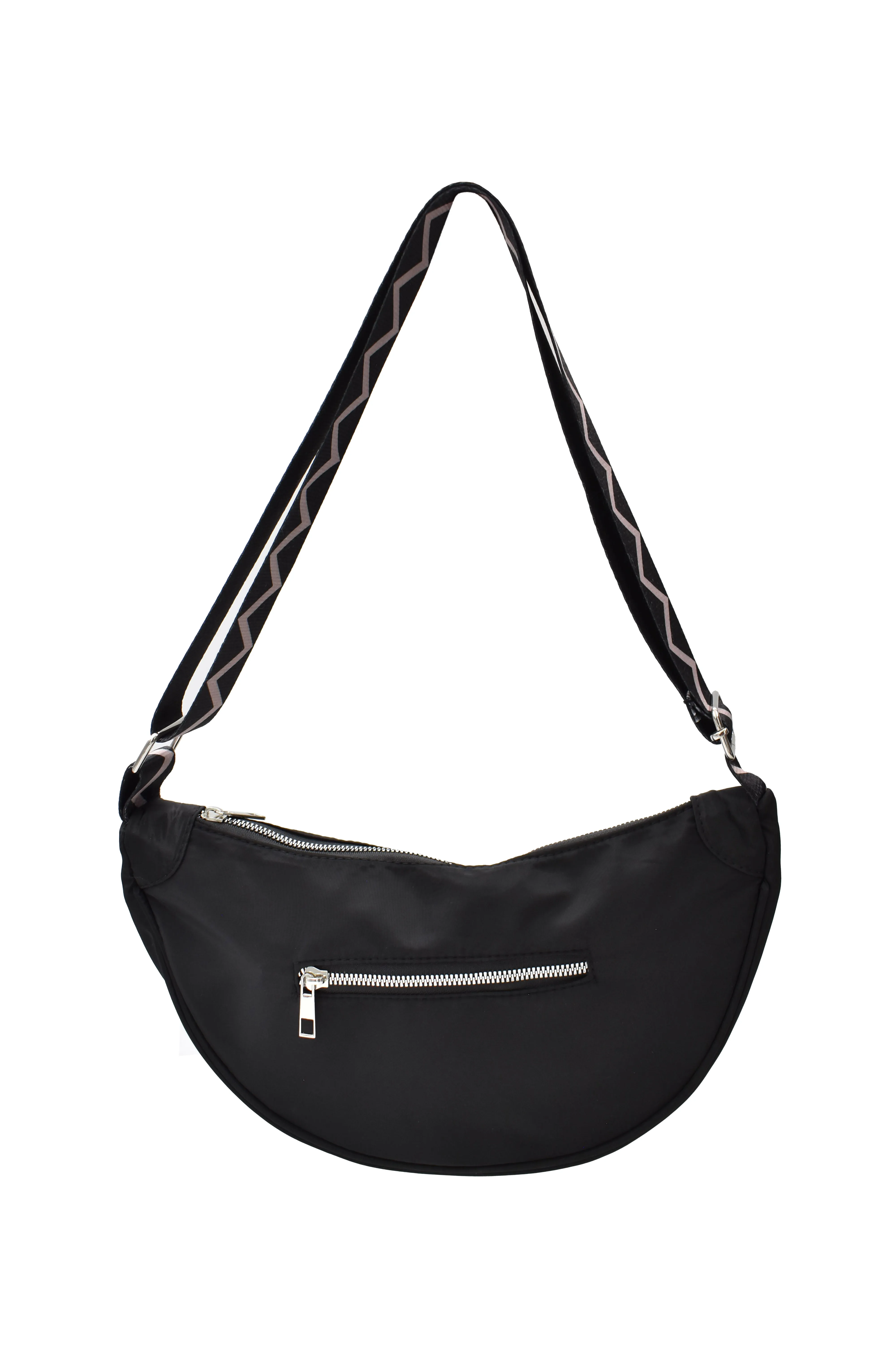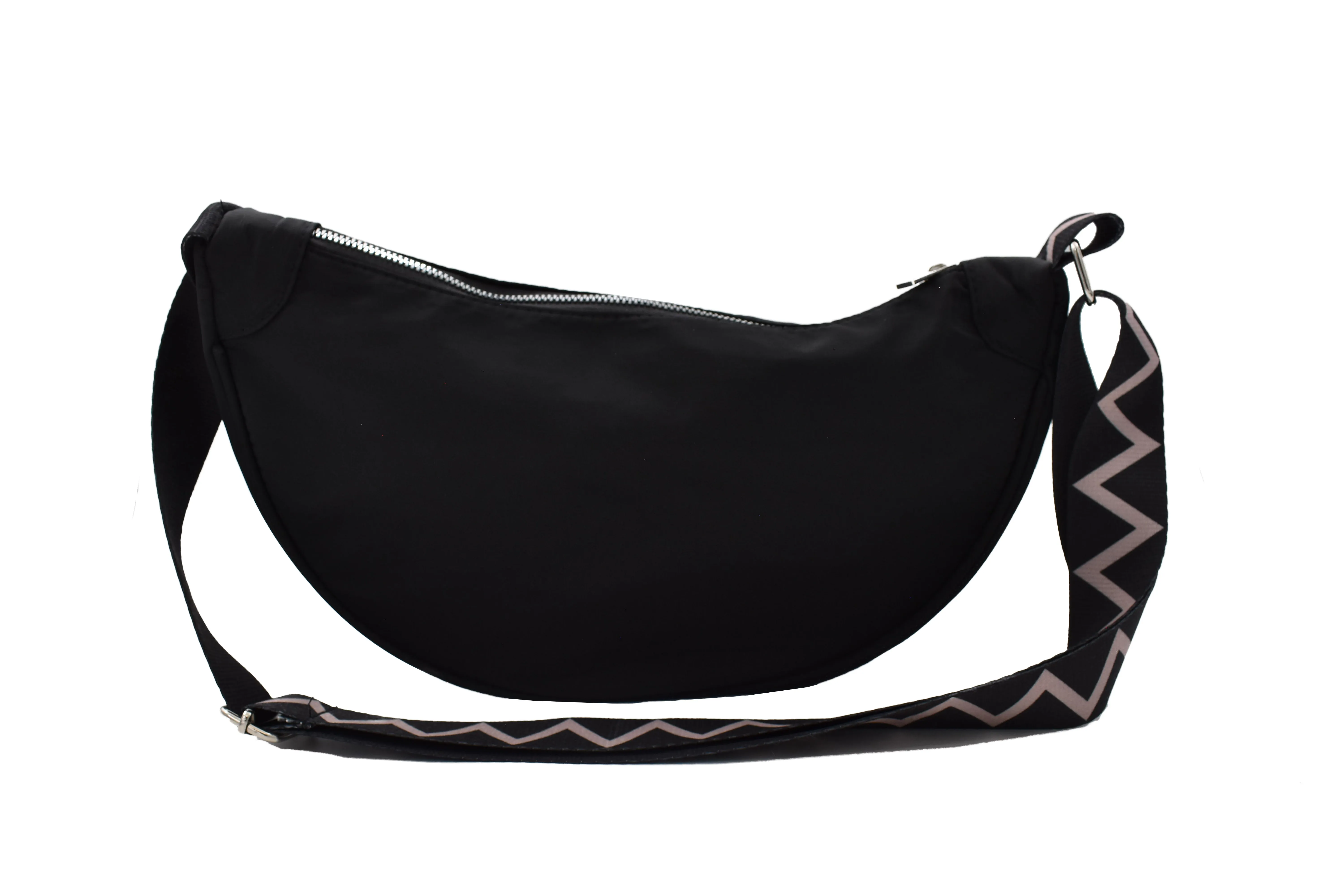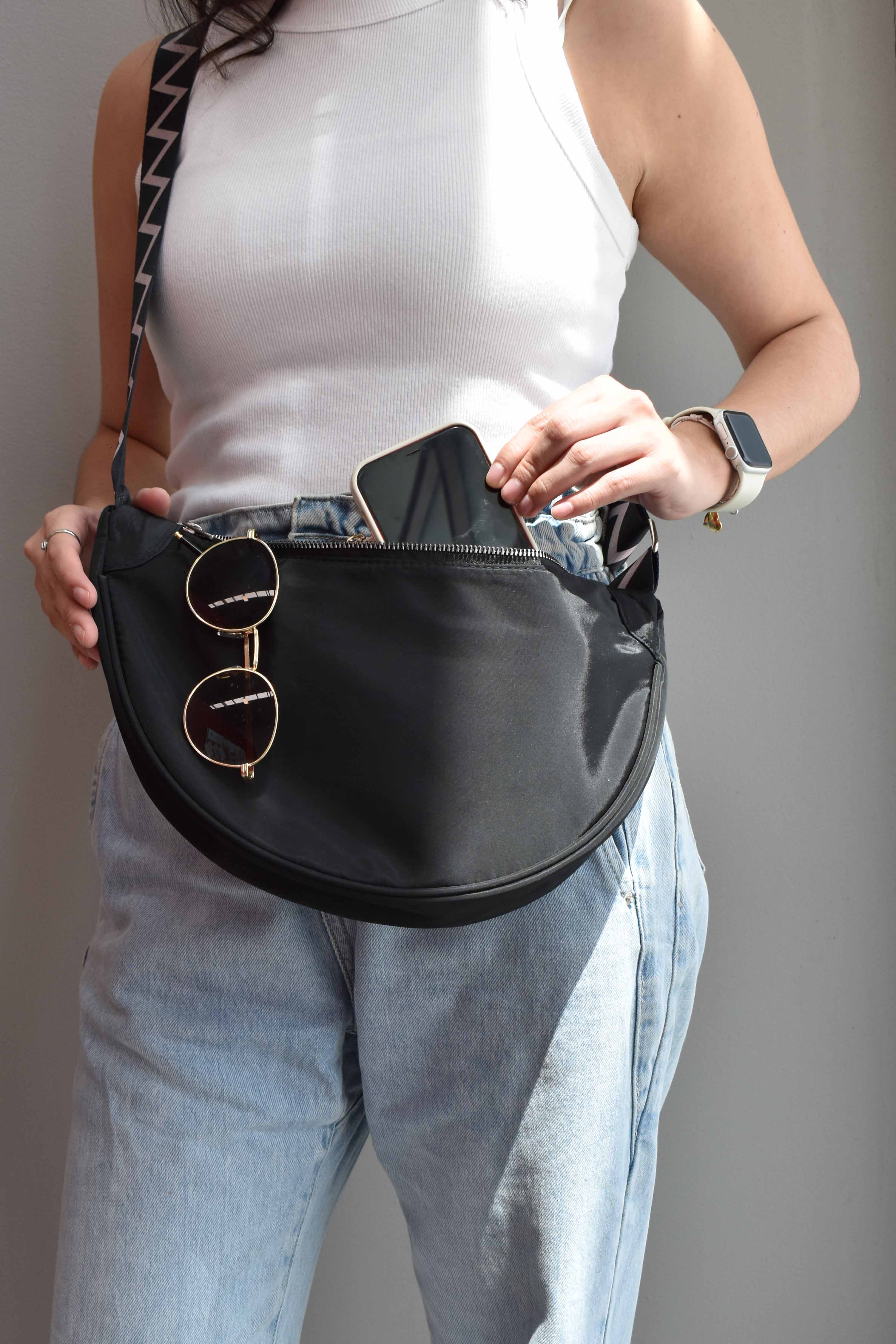INVIGORATE, Bolsa crossbody tipo riñonera color negro con cinta ajustable y tela impermeable, tiene un bolsillo exterior y un bolsillo interior, ambos con cierre para cuidar tus pertenencias, el diseño de la correa es bitono con diseño en zig zag. Color: Negro Correa: Bicolor Medidas: 34 largo x 18 alto x 7 cm ancho Correa ajustable de 69 cm a 125 cm Material: 100% Poliéster Instrucciones de cuidado: Lavar a mano con agua tibia (30°C), usar jabón neutro, no usar detergente ni blanqueadores, no exprimir, secar horizontal a la sombre, no planchar, no usar secadora.