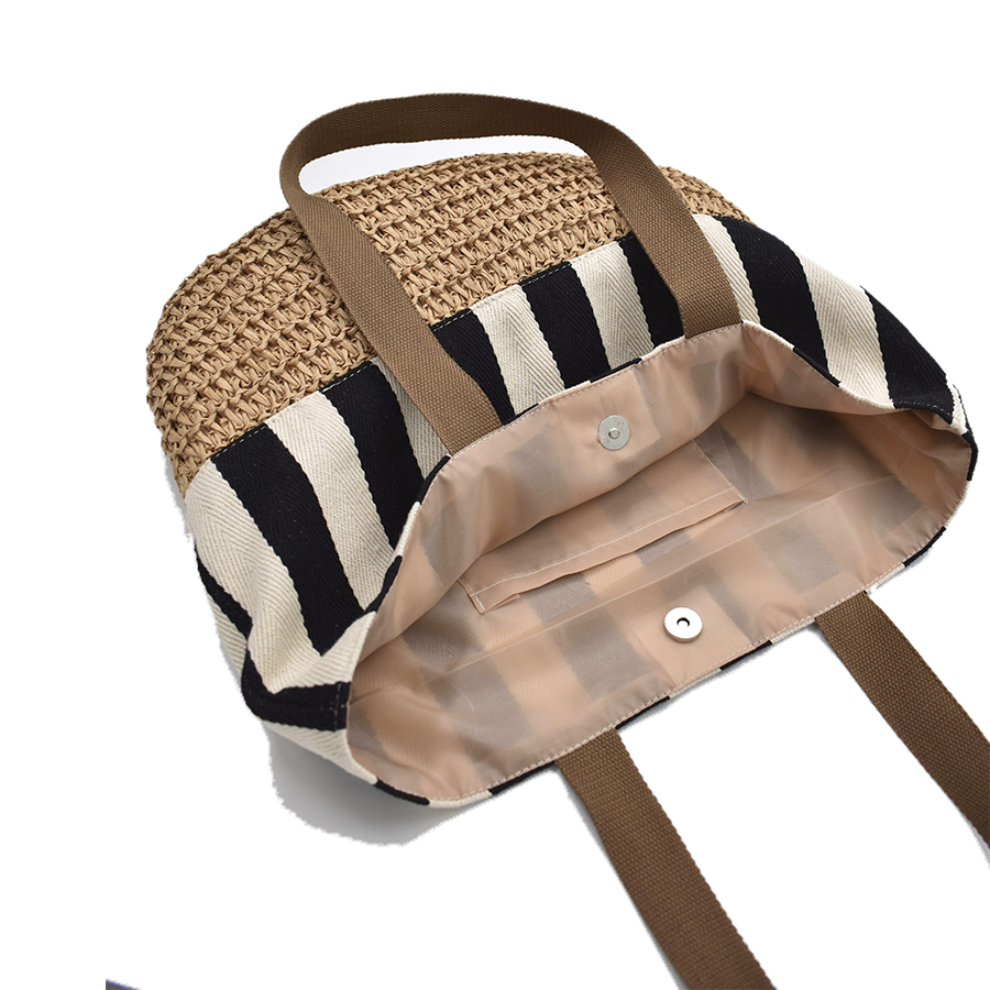 "Bolsa de playa grande color camel detalle en líneas verticales negras y beige con forro a tono, asa color negro, cuenta con broche para mayor seguridad, su tamaño es ideal para llevar lo necesario a un día de playa, pic nic, o fin de semana, puedes llevar traje de baño, toallas, sandalias, y hasta el celular, la cartera y tus lentes, ya que cuenta con un bolsillo interior que permite guardar con seguridad tus objetos más preciados. Medidas: 63 (con asa) 37 (sin asa) cm alto x 40 cm largo. Composición: 50% algodón, 30% papel (pulpa de celulosa), 20% poliéster Forro: 100% poliéster Limpiar con paño húmedo, no usar jabón, detergente ni blanqueadores, no exprimir, no planchar. "