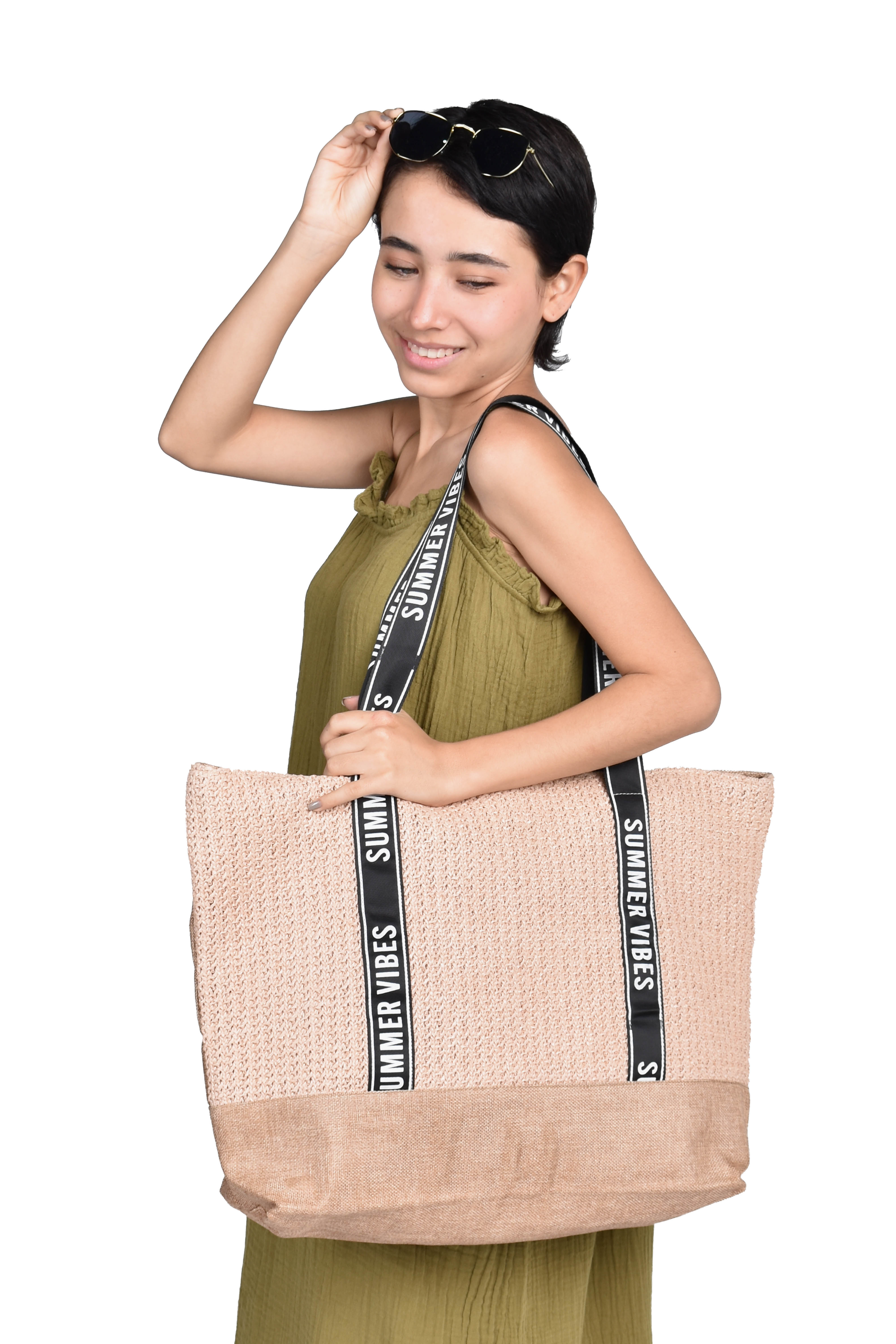 "INVIGORATE, Bolsa de playa beige con negro, espacio ideal para llevar tus cosas de vacaciones. Color: Beige / Negro Medidas: 60 cm x 55 cm x 14 cm Material: 100% Polipropileno 100% Poliéster Instrucciones de cuidado: Limpiar con un paño húmedo, no usar jabón, ni detergente, ni blanqueadores, no exprimir, no planchar, no usar secadora. "
