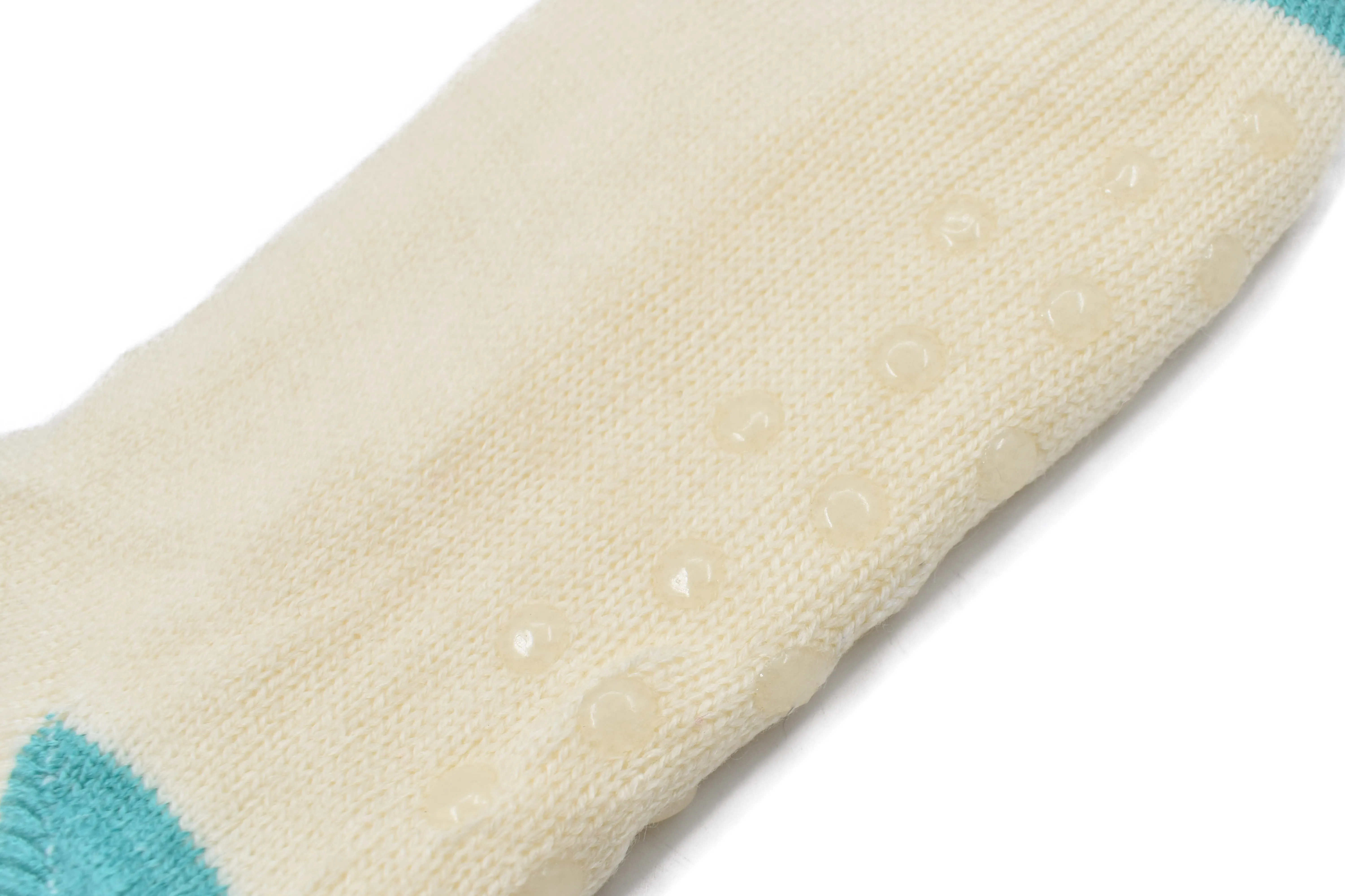 Calcetines invernales color beige, detalle de forro polar suave y acogedor, diseño en rayas color verde y lila, diseñados pensando en ti, cuentan con un agarre antideslizante en la parte inferior para mantenerte seguro. Proporcionar la máxima calidez y comodidad. Medidas: 40 cm largo x 11 cm ancho Color: Beige Composición: 85% acrílico 15% elastano. Instrucciones de cuidado: Lavar a mano con agua tibia (20°C), usar jabón neutro, no usar detergente ni blanqueadores, no exprimir, secar colgado a la sombra, no planchar.