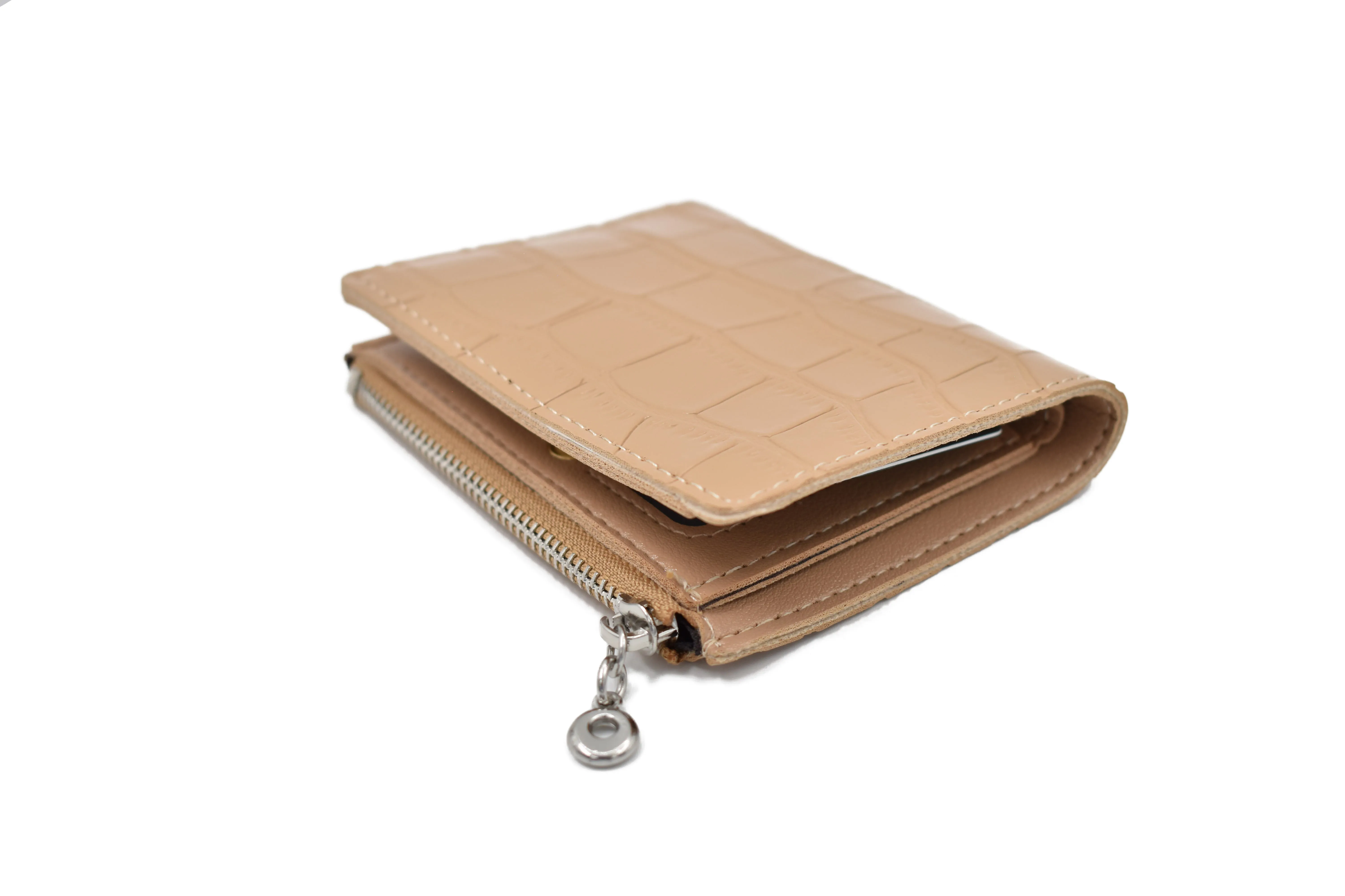 Cartera rectangular corta para dama color beige, textura tipo piel de cocodrilo suave al tacto, cuenta con un cierre horizontal estilizado color plata y broche a tono. Se puede utilizar todo el tiempo, es muy fácil de llevar. Color: Beige Color del cierre: Plata 1 Bolsillo 1 Compartimentos para billetes 3 Compartimentos para tarjetas 1 Compartimento de plástico transparente para identificación Medidas: 9 cm alto x 12 cm largo x 2 cm ancho Composición: poliuretano. Forro: poliuretano Instrucciones de cuidado: Limpiar con paño seco.
