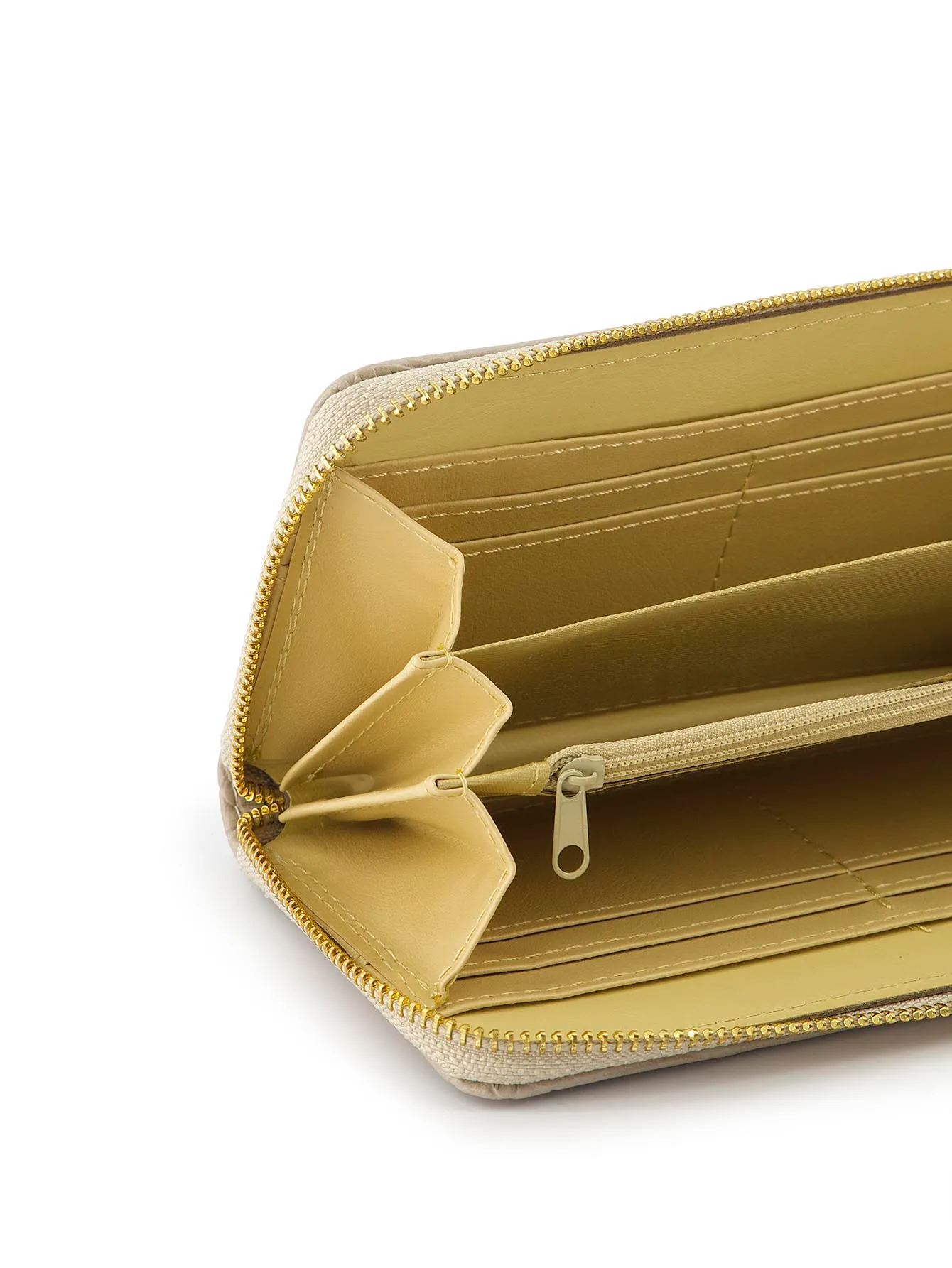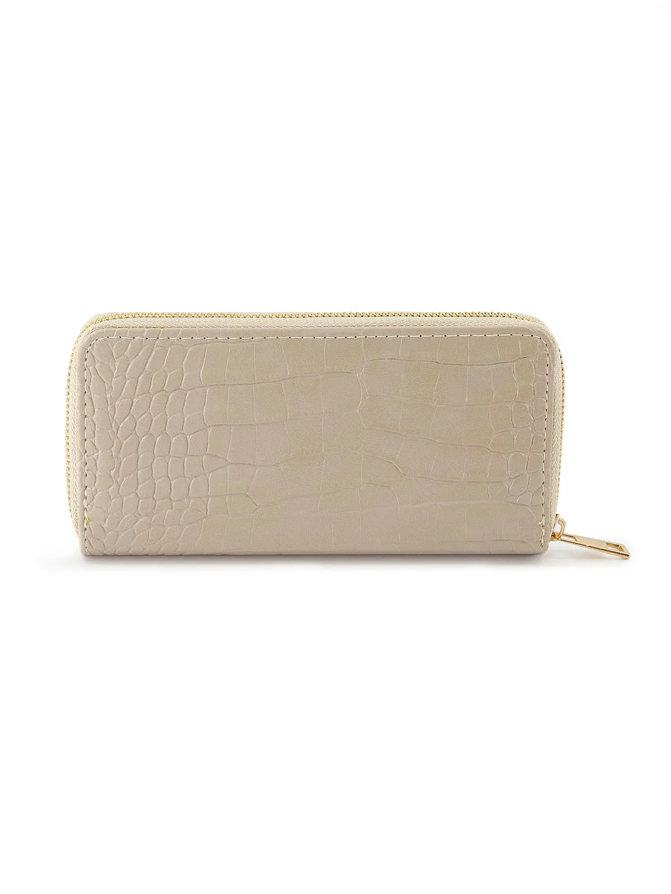 Cartera rectangular para mujer color beige, texturiza tipo piel de cocodrilo, diseño de doble pliegue con 8 ranuras para tarjetas, 1 para celular, 1 divisiones para monedas 4 compartimento para billetes cuenta con 1 cierre horizontales estilizado color dorado. Se puede utilizar todo el tiempo, es muy fácil de llevar. Color: Beige. Color del cierre: Dorado. 8 ranuras para tarjetas 1 para celular 1 divisiones para monedas 4 compartimento para billetes Medidas: 9 cm alto x 19 cm largo x 2.5 cm ancho Composición: Exterior: 100% material sintético / 100% poliuretano. Forro: 100% poliéster Instrucciones de cuidado: Limpiar con paño seco.