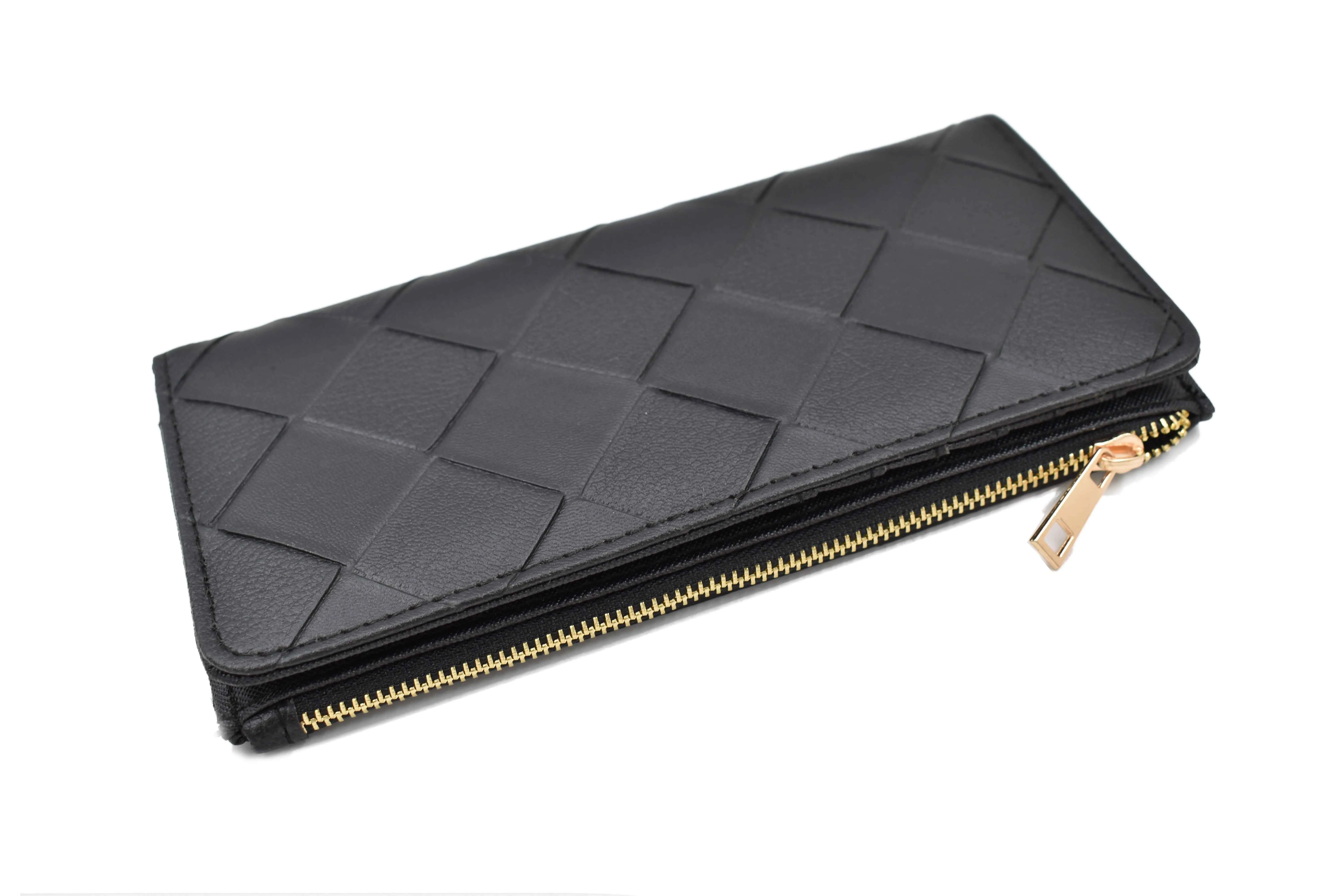 Cartera rectangular para mujer color negro, diseño en rombos texturizado, cuenta con broche para mayor seguridad, diseño de doble pliegue con 5 ranuras para tarjetas, 4 compartimento para billetes cuenta con 1 cierre horizontal para monedas estilizado color dorado. Se puede utilizar todo el tiempo, es muy fácil de llevar. Color: Negro. Color del cierre: Dorado. 5 ranuras para tarjetas 1 cierre horizontal para monedas estilizado color dorado 4 compartimento para billetes Medidas: 9.5 cm alto x 19 cm largo x 1.5 cm ancho (cierre) Composición: Exterior: 100% material sintético / 100% poliuretano. Forro: 100% poliéster Instrucciones de cuidado: Limpiar con paño seco.