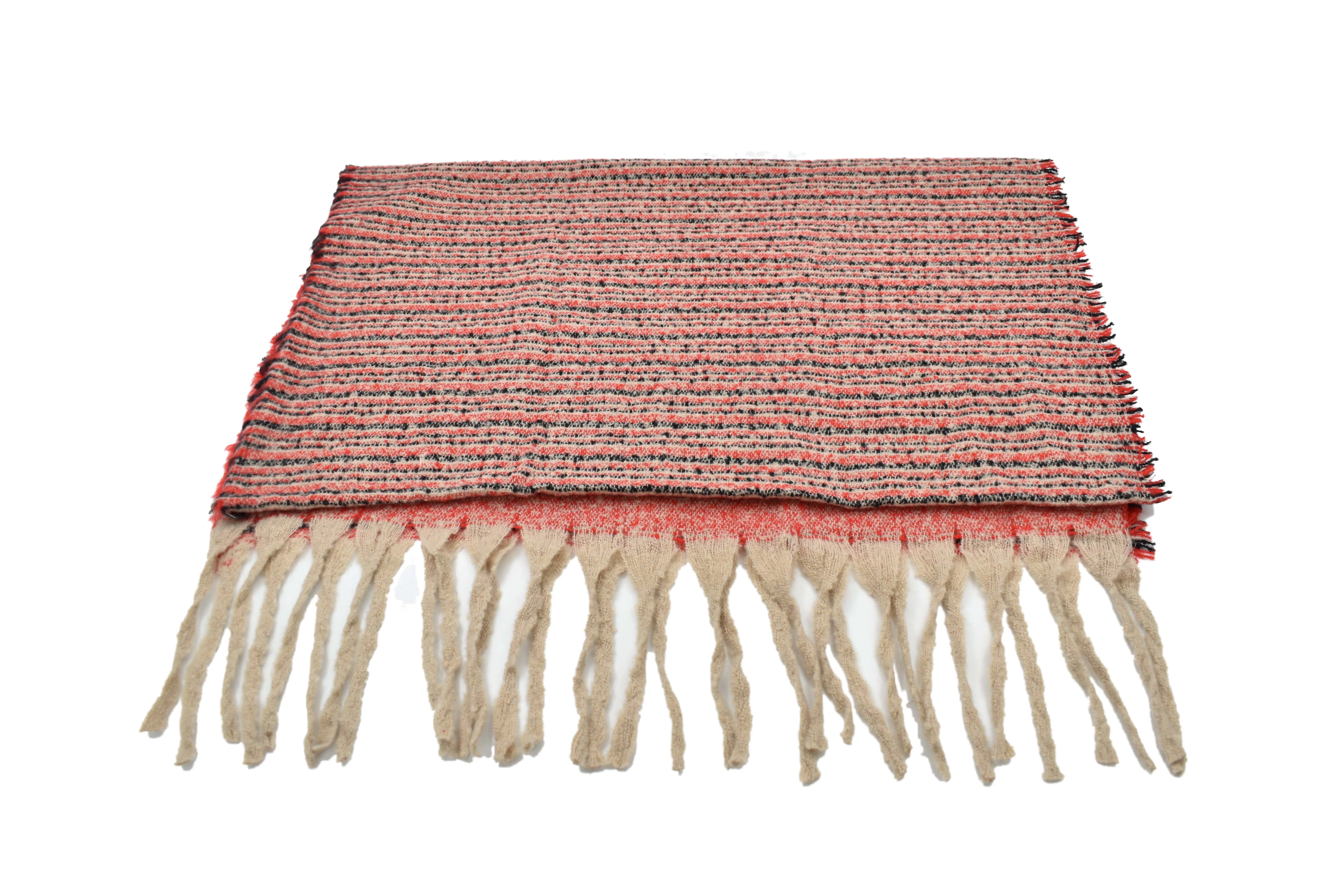 Chal afelpado color rojo, detalle en rayas horizontales multicolor (negro, beige y rojo), terminación en barbas color beige, proporciona ayudan a mantenerte a una temperatura agradable, lo mejor es que son muy prácticas, fácil de combinar, fácil de guardar, las usas como quieras Medidas: 214 cm largo x 70 cm ancho Composición: 100% poliéster Instrucciones de cuidado: Lavar a mano con agua tibia (30°), usar jabón neutro, no usar detergente ni blanqueadores, no exprimir, secar colgado a la sombra, no planchar