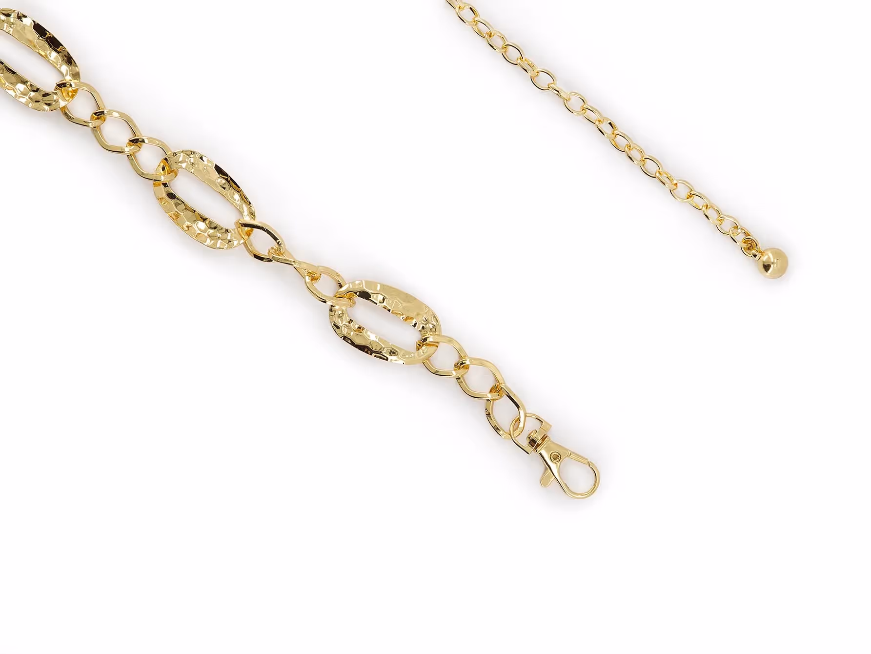 Cinturón de cadena color dorado para dama, eslabones ovalados a tono martillados, con colgante redondo, diseño de cierre es de gancho. Puedes ajustar el cinturón en cualquier posición que desees según la cintura. Puedes combinar perfectamente este cinturón de cadena con cualquier prenda deseada, atuendos casuales como jeans, pantalones cortos, traje, camisa, vestidos, también lo puedes usar en atuendos especiales como bodas, fiestas, reuniones, etc. Color: Dorado Talla: Única Medidas: 117 cm (punta a punta) largo x 2.5 cm ancho Composición: Metal Instrucciones de cuidado: Limpiar con paño seco