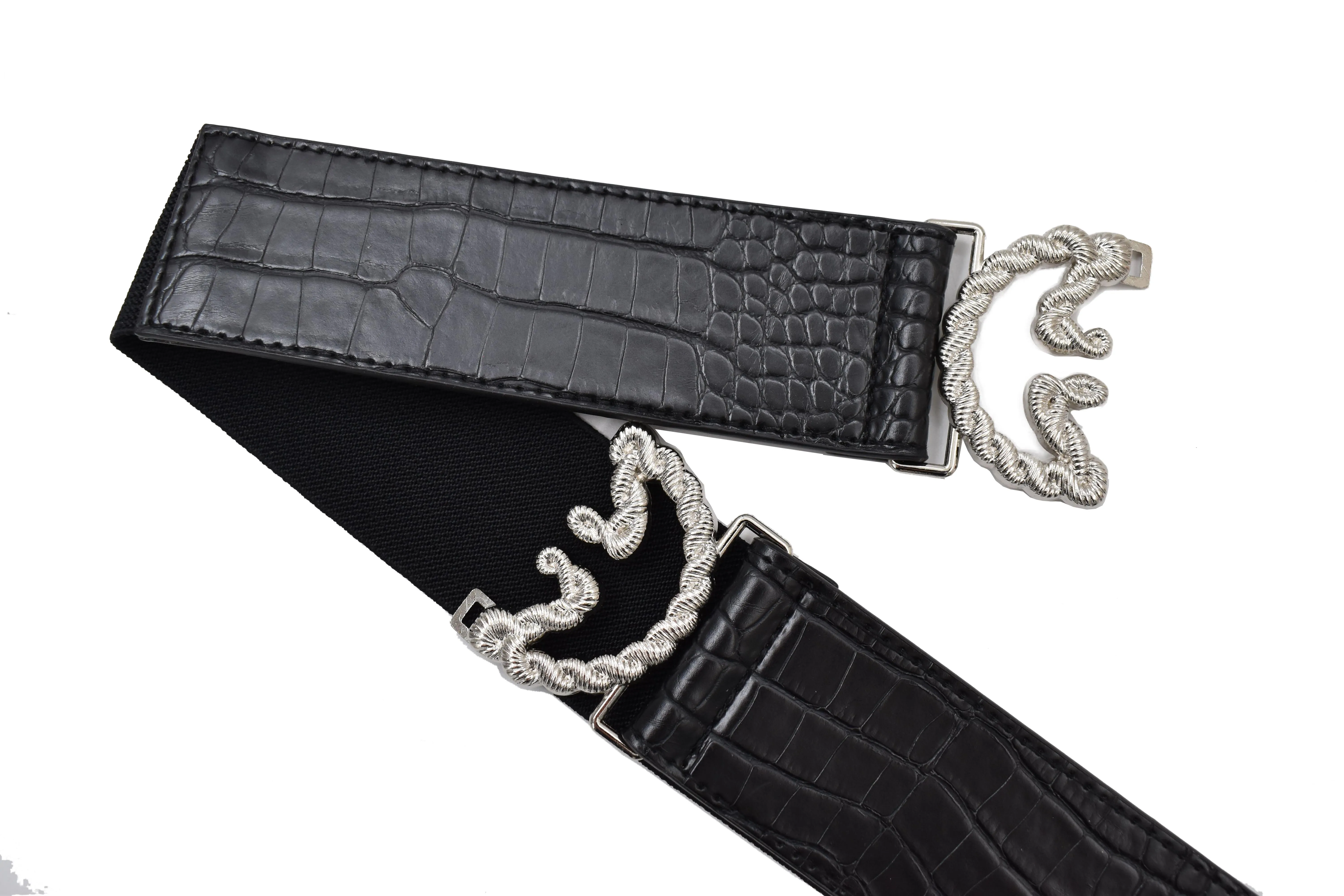 Cinturón elástico negro craquelado con hebilla plata con detalle, tiene un ajuste perfecto para cualquier prenda. Color: Negro Medidas: 75 cm largo x 5 cm ancho Estira hasta 100 cm de largo Medidas de la hebilla: 8 cm largo x 6 cm de alto Material: 95% poliéster, 5 % elastano Instrucciones de cuidado: Limpiar con un paño seco, no usar jabón detergente, ni blanqueadores, no exprimir, no planchar, no usar secadora.