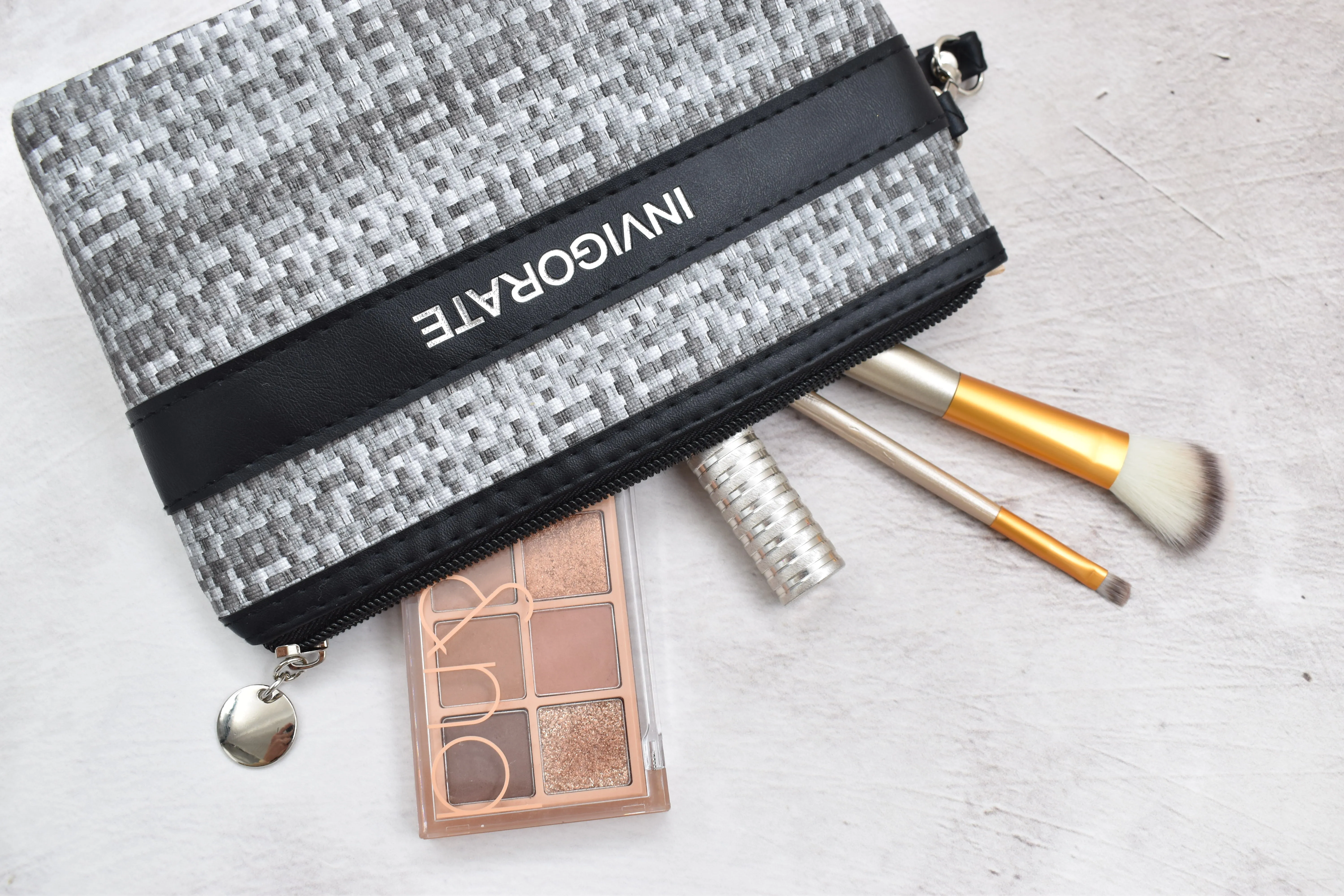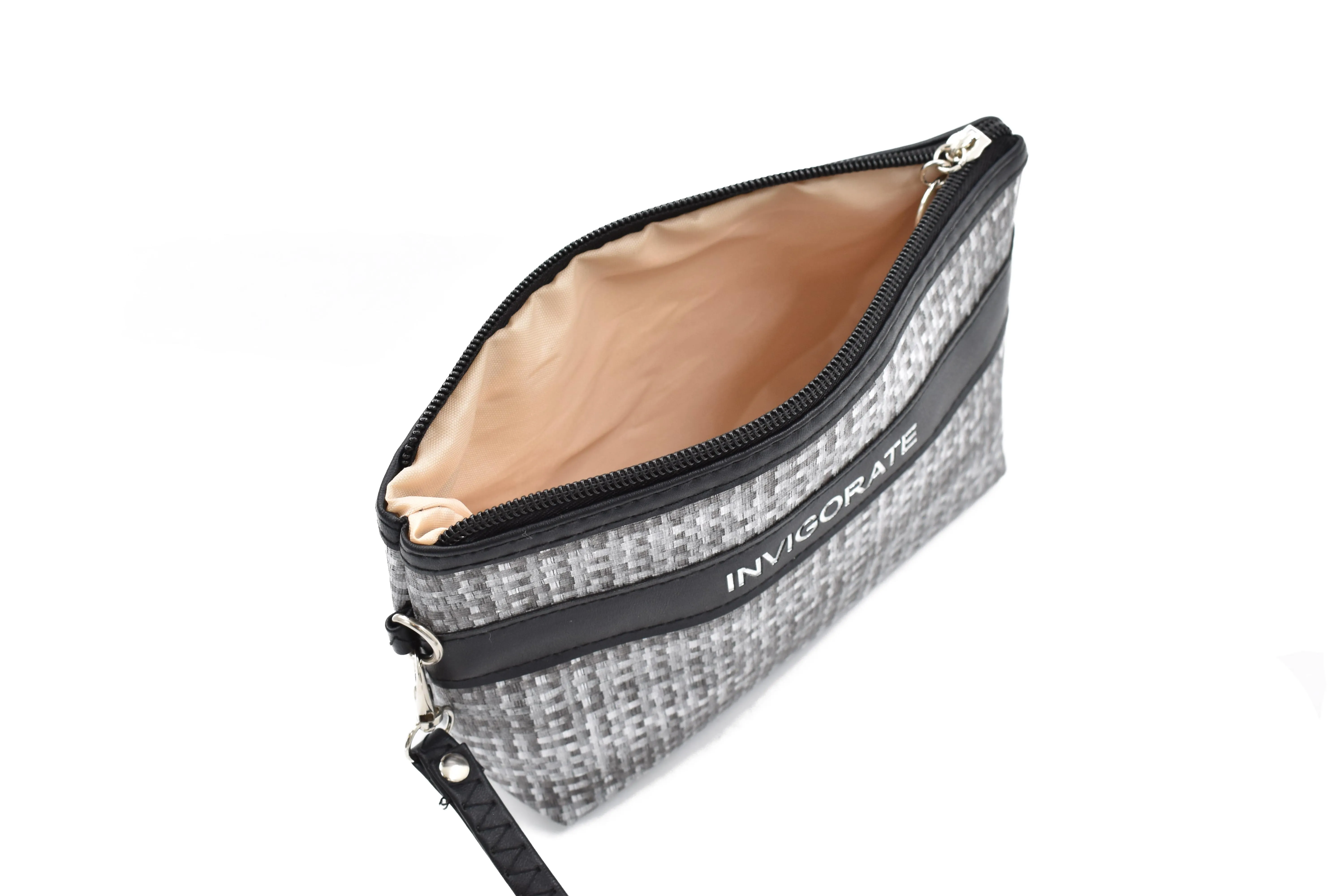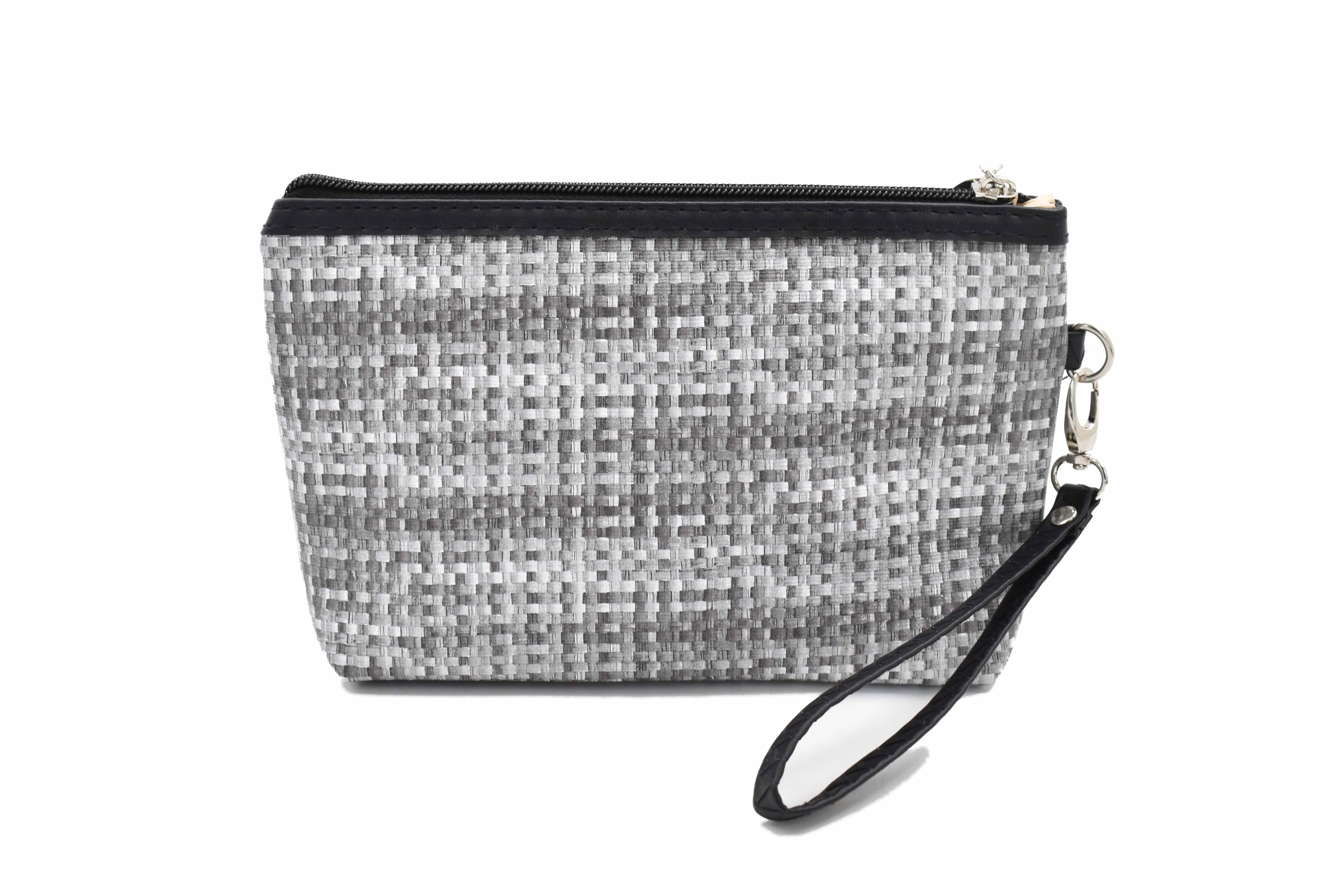 Cosmetiquera portátil con correa negra, diseño de tejido ideal para tu maquillaje básico. Color: Negro Medidas: 13 cm alto x 22 cm largo x 6.5 cm ancho. Composición: 100% Material sintético / 100% poliuretano Instrucciones de cuidado: Lavar a mano con agua tibia, usar jabón neutro, no usar detergente ni blanqueadores, no exprimir, secar colgado a la sombra, no planchar.