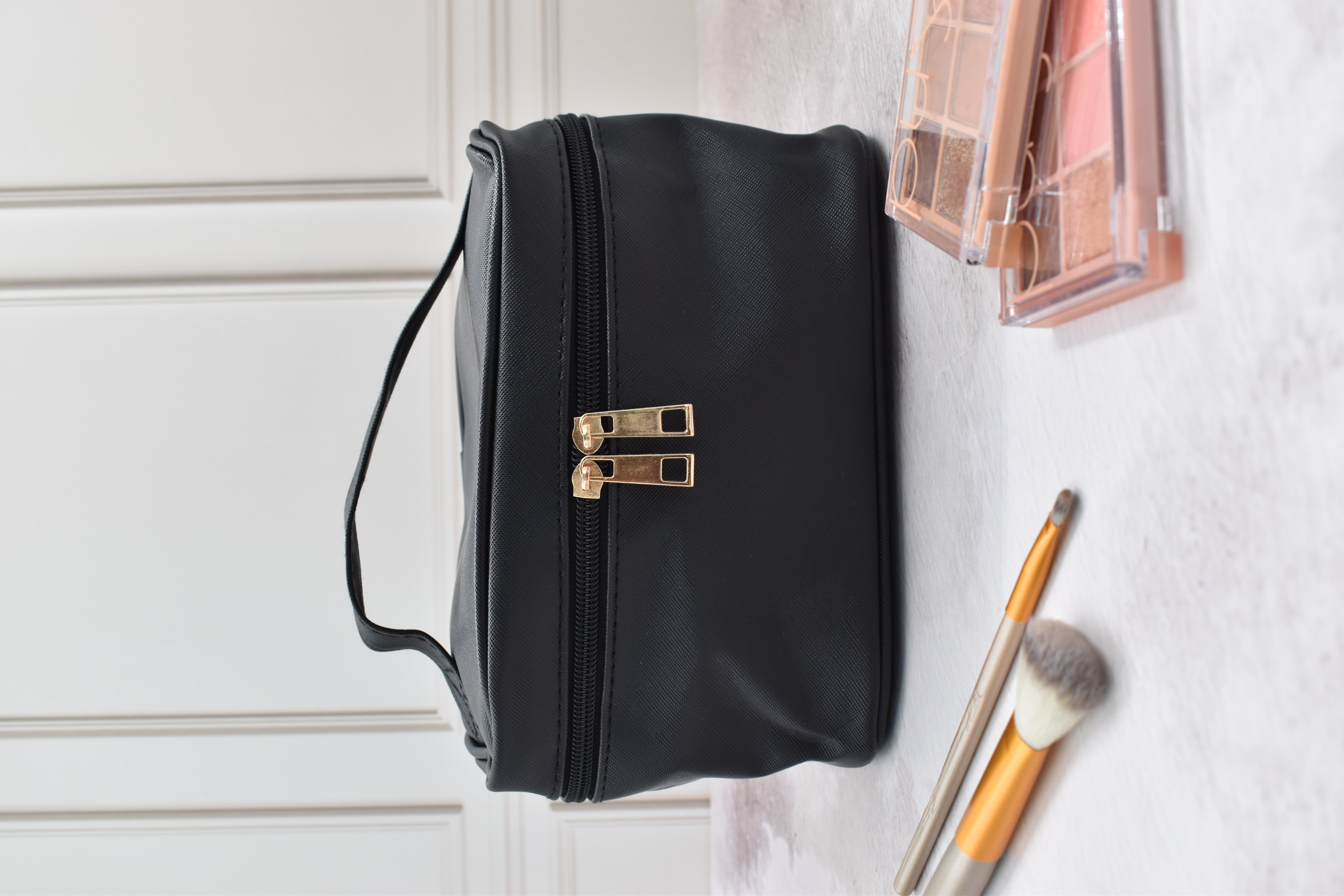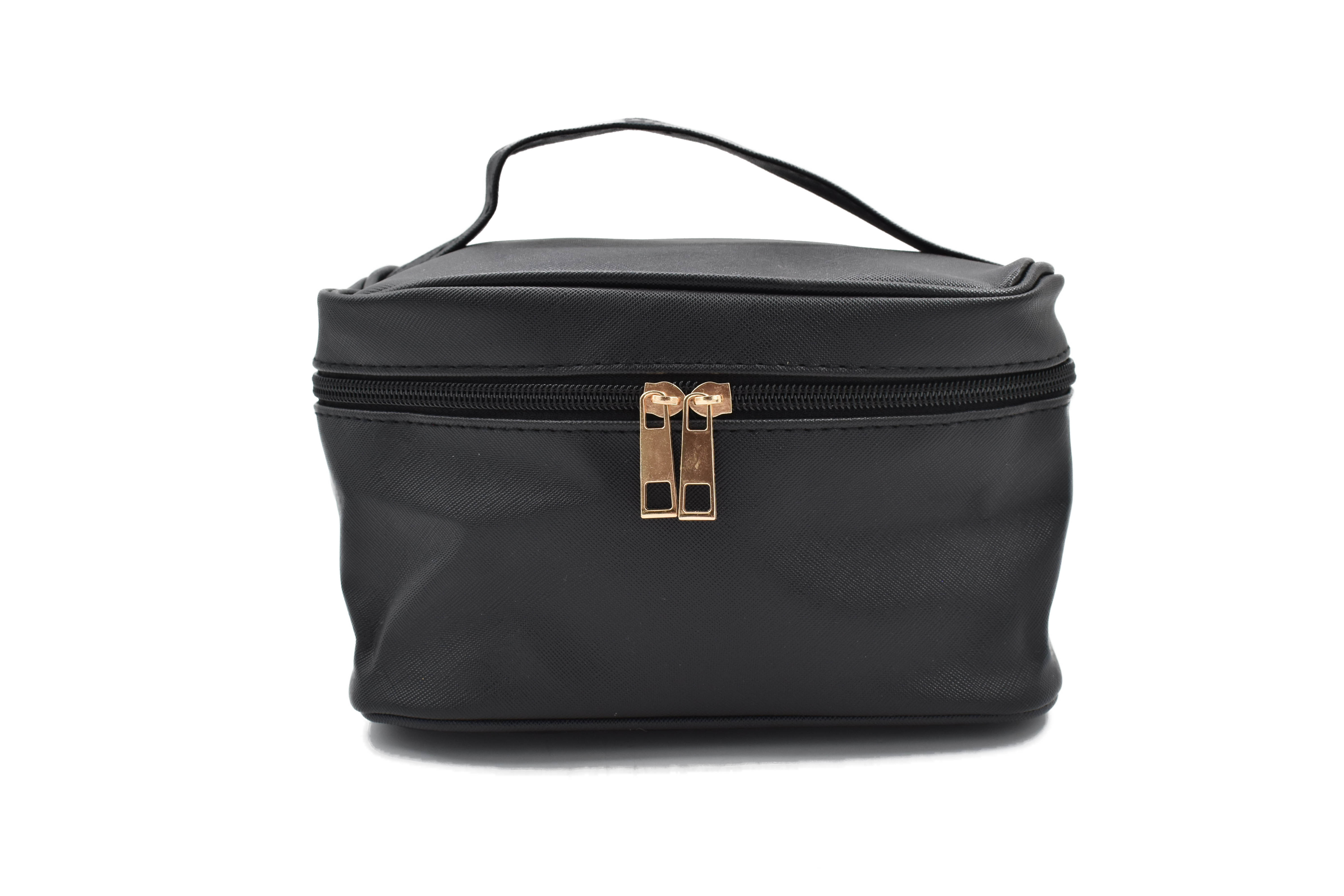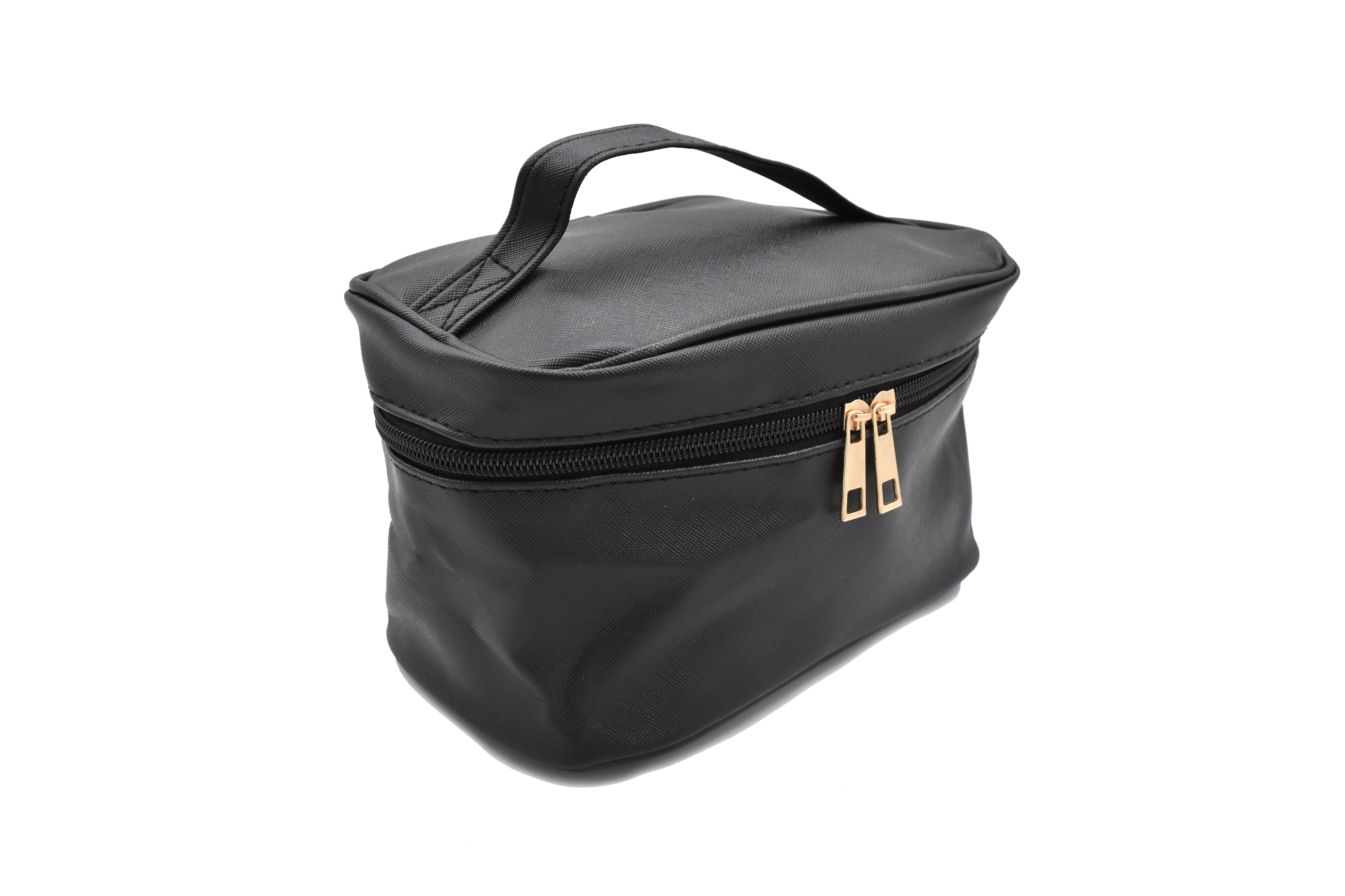 Cosmetiquera básica con asa color negra, cuenta con amplio espacio para guardar todo tu maquillaje o artículos de viaje. Color: Negro Medidas: 13 cm alto x 22cm largo x 12cm ancho. Composición: 100% Poliuretano. Forro: Poliéster Instrucciones de cuidado: Lavar a mano con agua tibia, usar jabón neutro, no usar detergente ni blanqueadores, no exprimir, secar colgado a la sombra, no planchar.