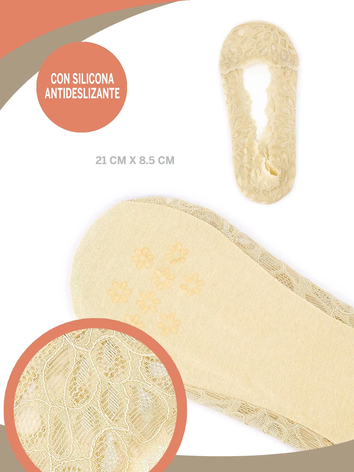 INVIGORATE, Cubre pie nylon encaje beige, tela cómoda y fresca, invisibles ideal para usar con tenis o zapatos. Color: Beige Talla: 22-24 cm Material: 47% algodón, 45% nylon, 8% elastano Instrucciones de cuidado: Lavar a mano con agua tibia (30°), usar jabón neutro, no usar detergente, ni blanqueadores, no exprimir, secar colgado a la sombra, no planchar.