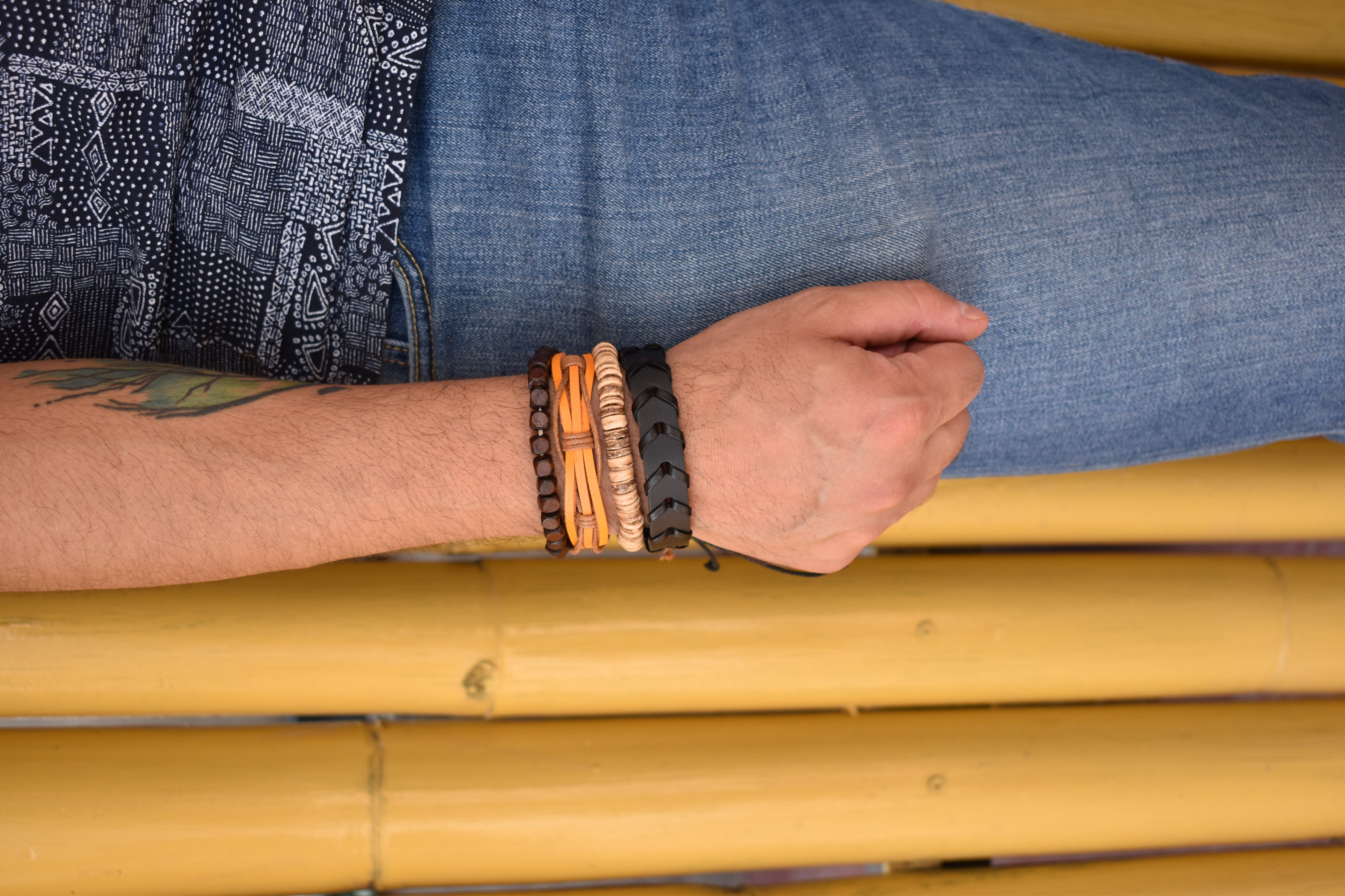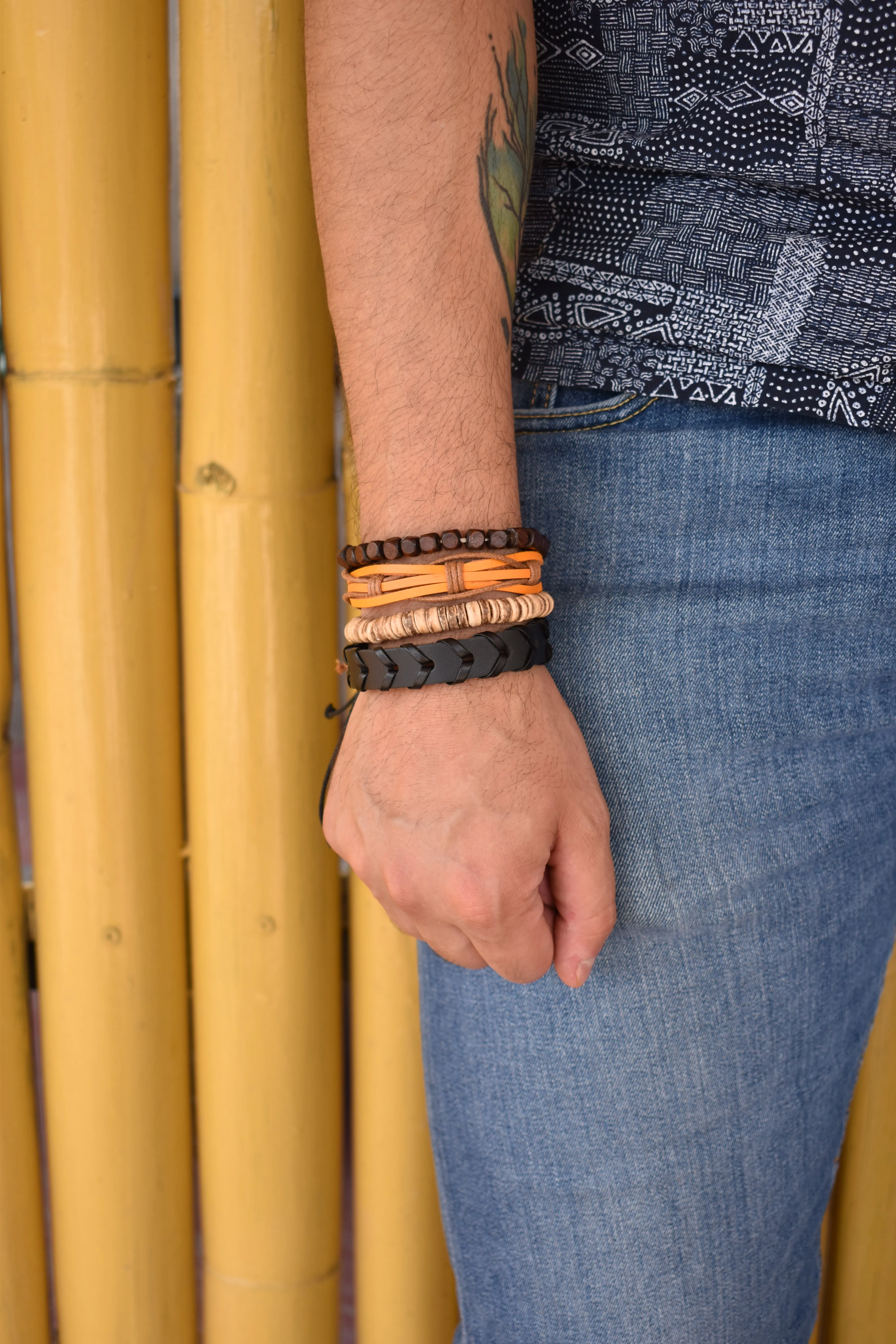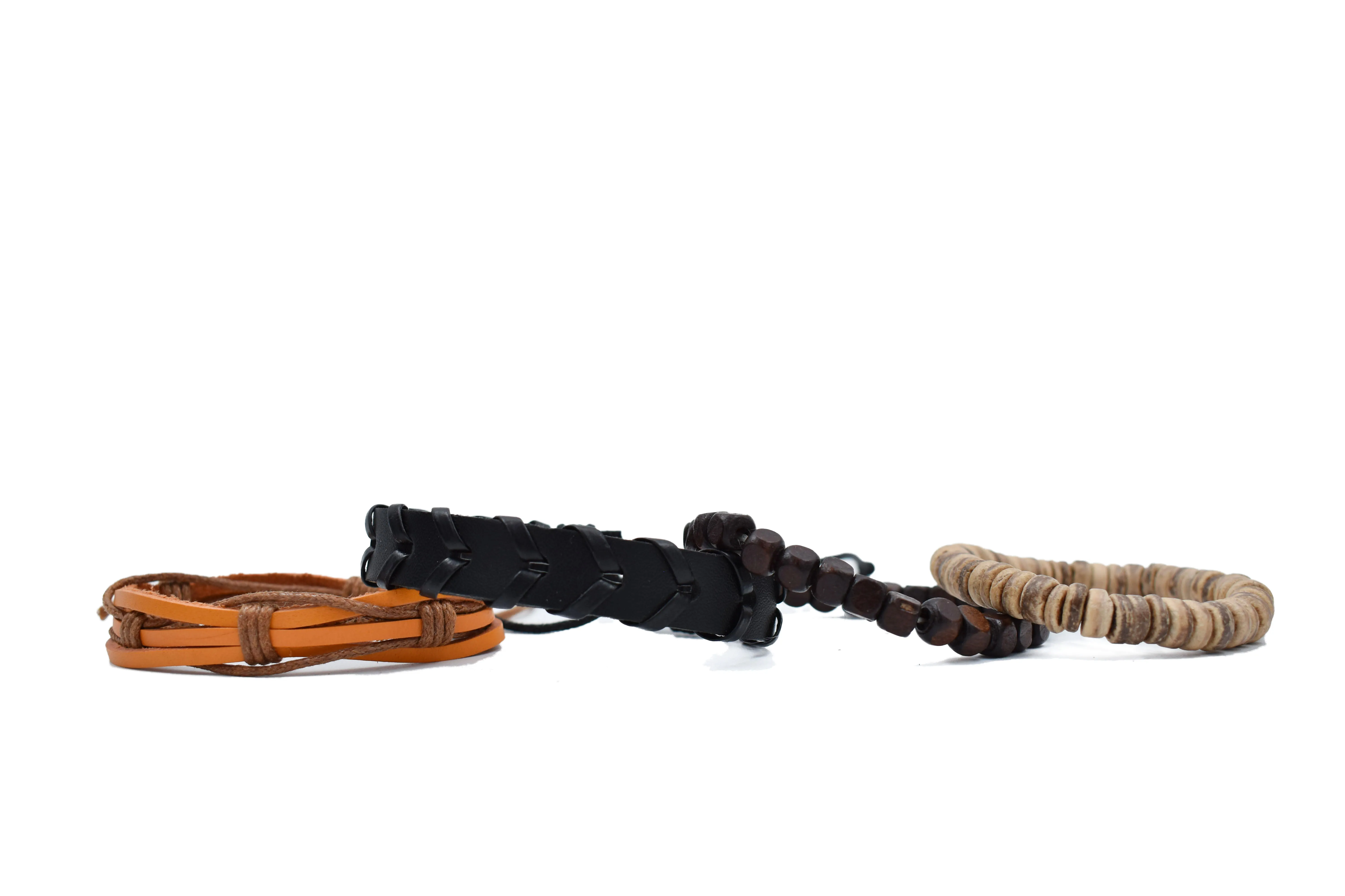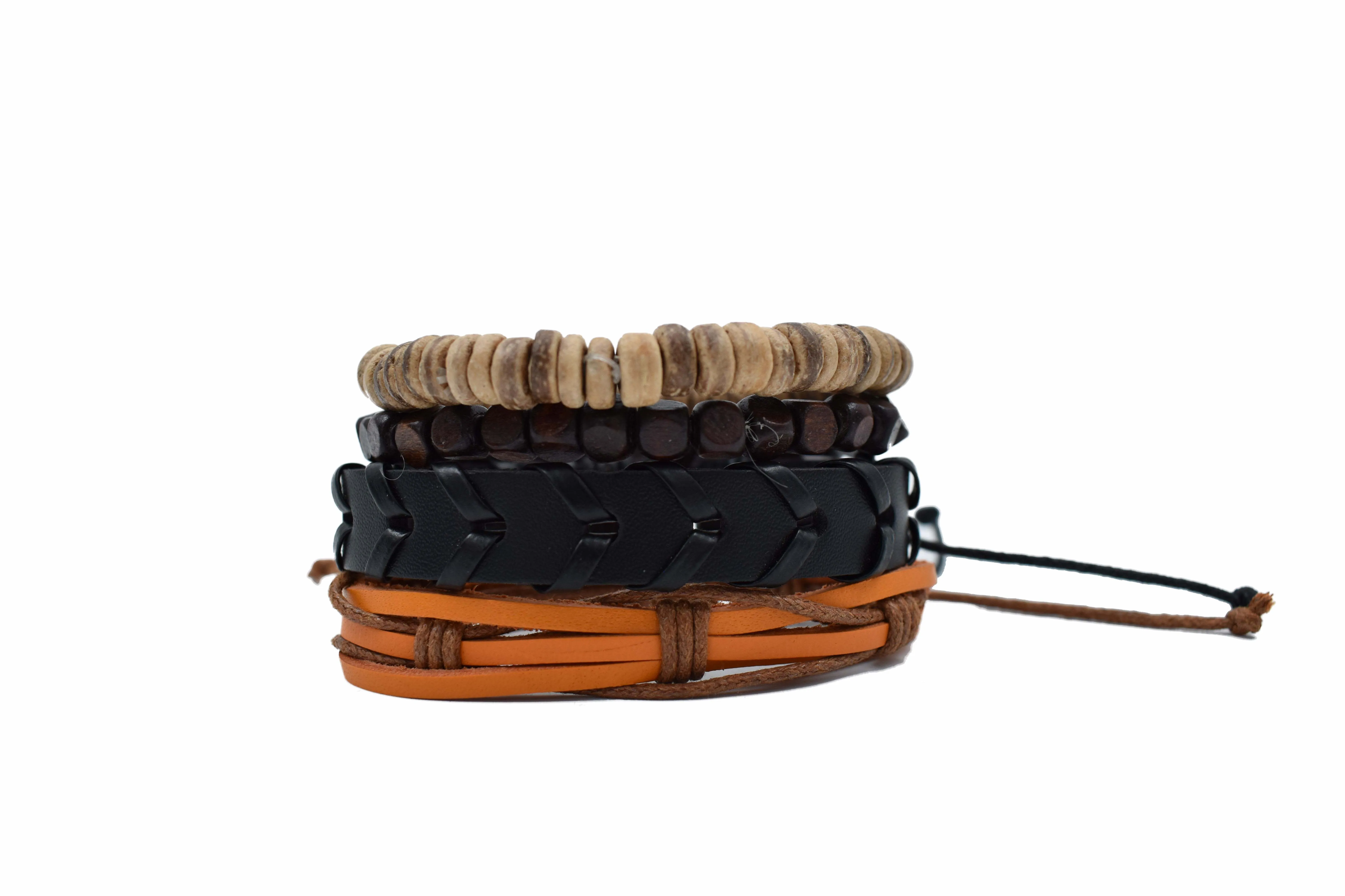 Juego de pulseras artesanales para hombre ajustables, diseño tipo boho, cada paquete cuenta con varias pulseras de diferentes materiales (cuero y tejidas), multicolor. Composición y colores: Pulsera 1: Color naranja/café, piel de animal vacuno, 100% algodón Pulsera 2: Color negro, 85% poliuretano, 15% algodón. Pulsera 3: Color café, cáscara de coco. Pulsera 4: beige, madera. Instrucciones de cuidado. Limpiar con paño seco. Medidas: 6 cm de diámetro. Visita nuestras publicaciones, encontrarás más diseños. Moda a precio accesible.
