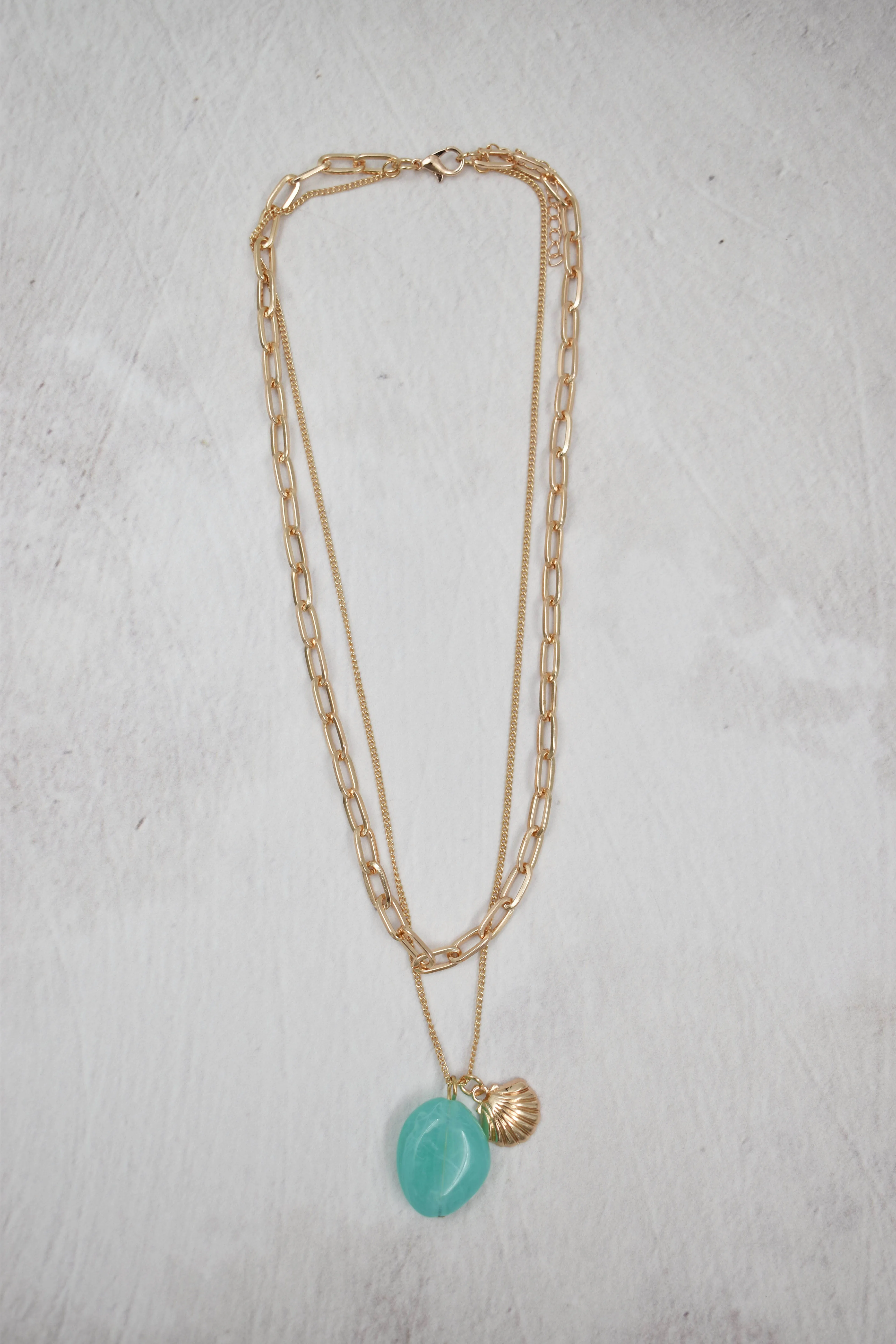 Multicollar para mujer color dorado, detalle de cuarzo jade color verde aqua y concha de mar color dorado, ligero y cómodo Medidas: Dije concha de mar: 1.2 cm alto x 1.5 cm ancho Cuarzo Jade: 3.5 cm alto x 2 cm ancho Collar: 43 cm largo Composición: 70% zinc, 20% resina, 10% hierro Instrucciones de cuidado: Limpiar con paño seco.