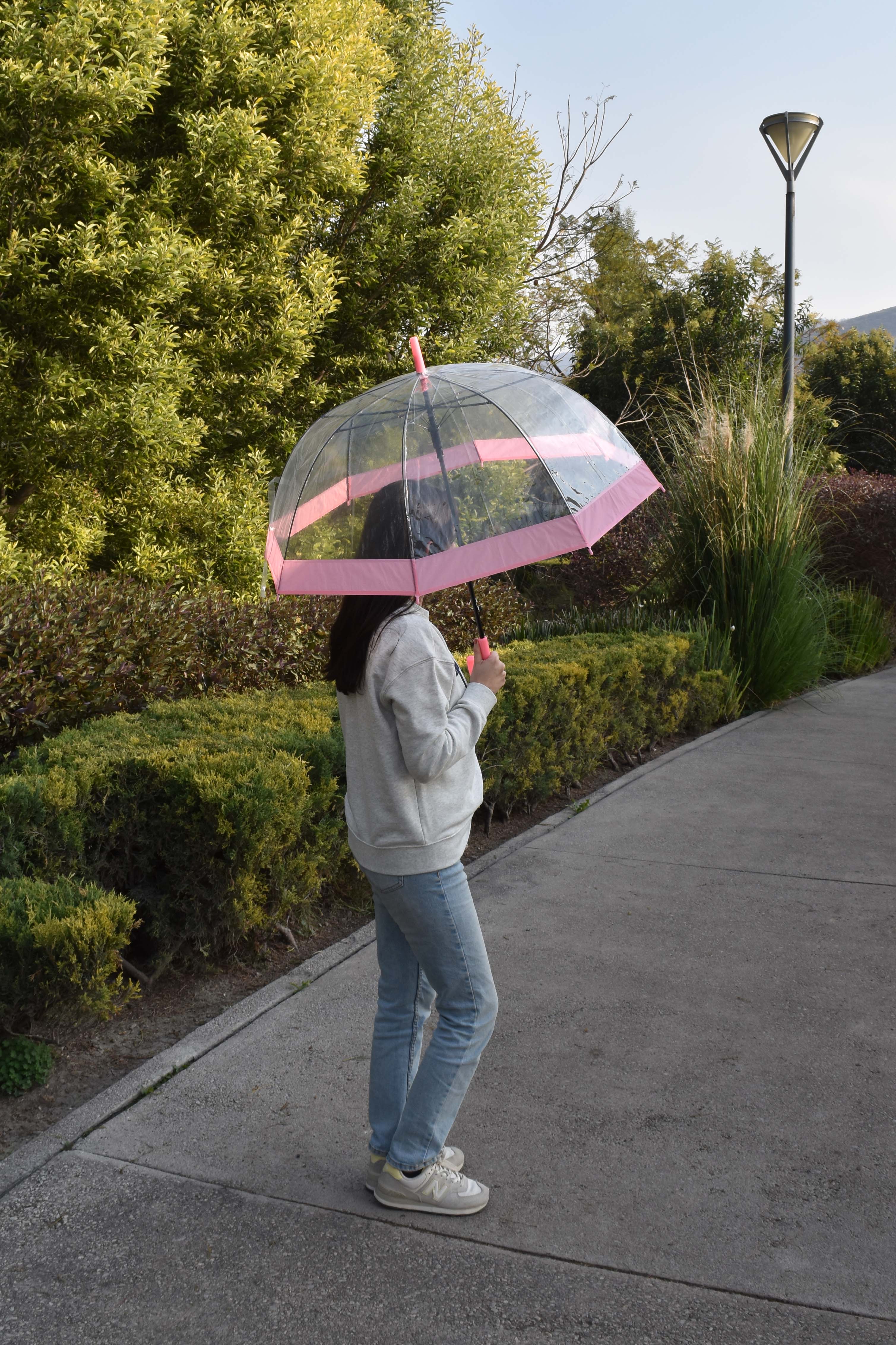 "Tu aliado perfecto bajo la lluvia Color: Transparente Diámetro: 86 cm Diseño: Bastón Composición: Plástico Instrucciones de cuidado: Limpiar con paño húmedo"