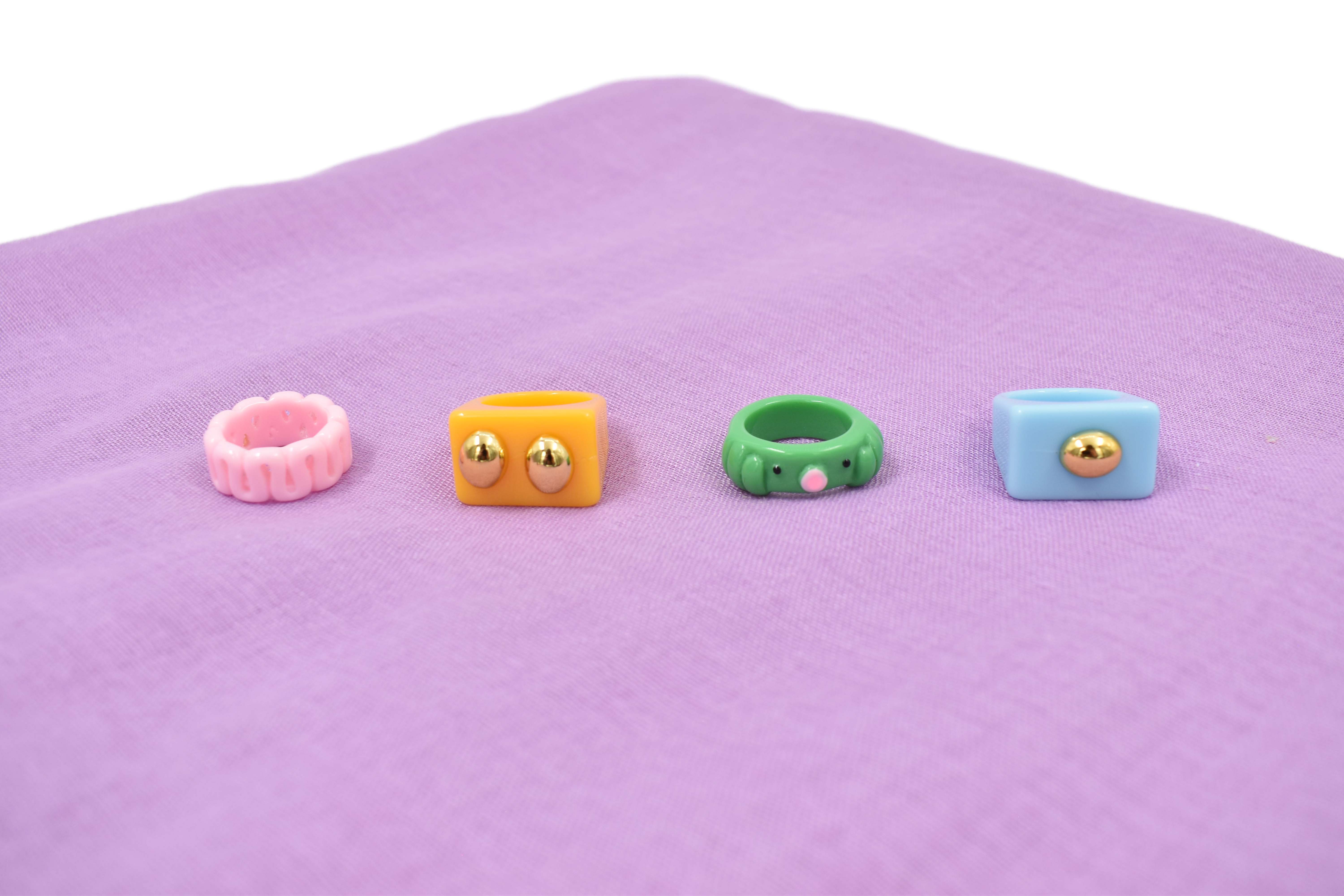 Set de 4 anillos de resina multicolor (verde, amarillo, azul y rosa) diferentes diseños y texturas, ideal para uso diario, cómodos y resistentes. Colores y medidas: Composición: Resina Anillo azul rectangular: 1.5 cm alto x 2 cm largo x 1.5 cm (anillo) .5 mm (dije) ancho. Anillo amarillo rectangular: 1.5 cm alto x 2 cm largo x 1.5 (anillo) 14 cm (dije) ancho. Anillo verde con carita: 1 cm alto x 1.5 cm largo x 1 cm ancho Anillo rosa con ondas: 1 cm alto x 2 cm largo x 1 cm ancho Talla: Rosa: 6 | Verde: 6.5 | Amarillo: 8 | Azul: 8 Composición: Resina Instrucciones de cuidado: Limpiar con paño seco.