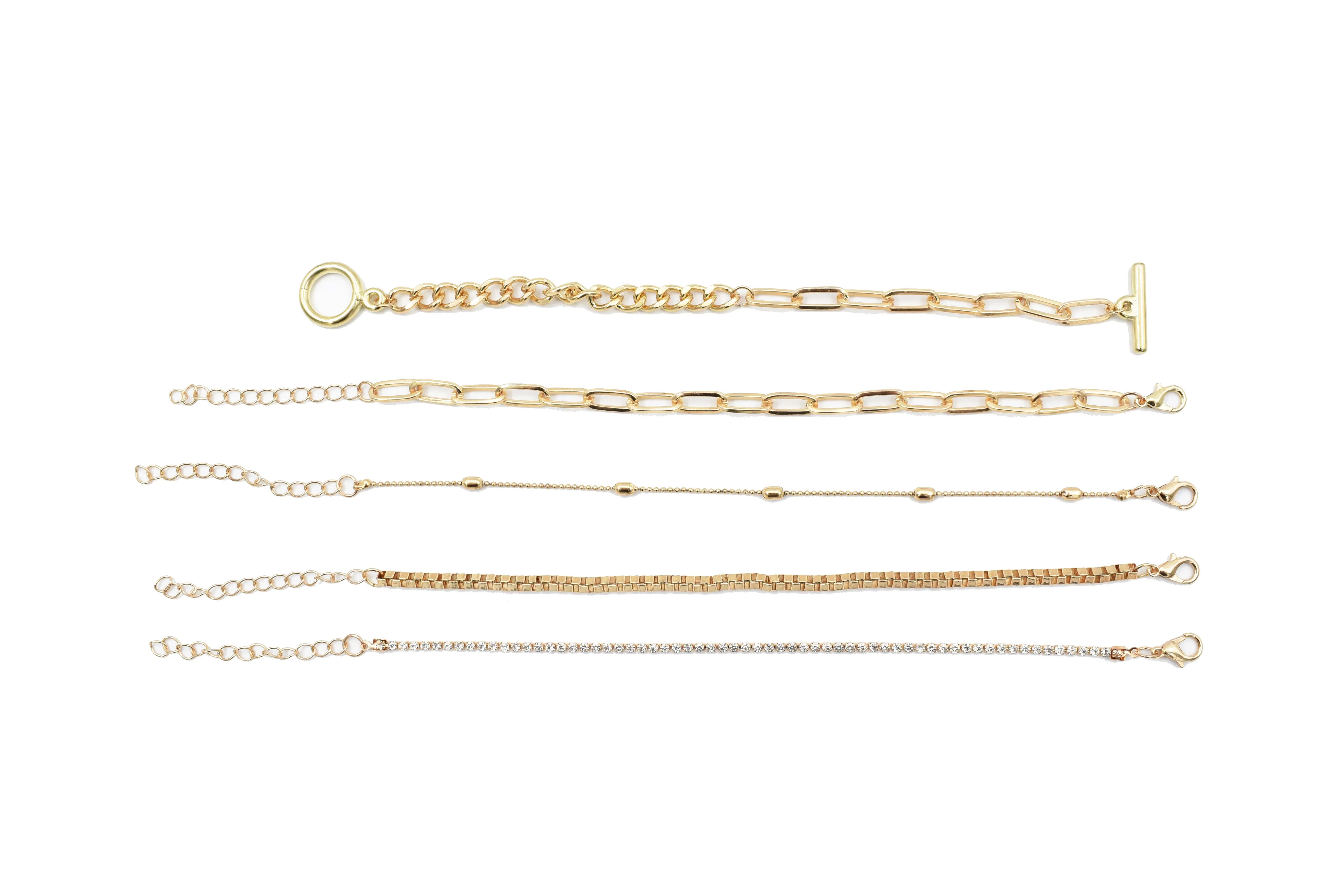 Set de 5 pulseras para dama color dorado, diferentes diseños entrelazados y pedrería. Medidas : 0.5 cm alto x 20 cm largo. Color: Dorado. Composición: Metal. Instrucciones de cuidado: Limpiar con paño seco.