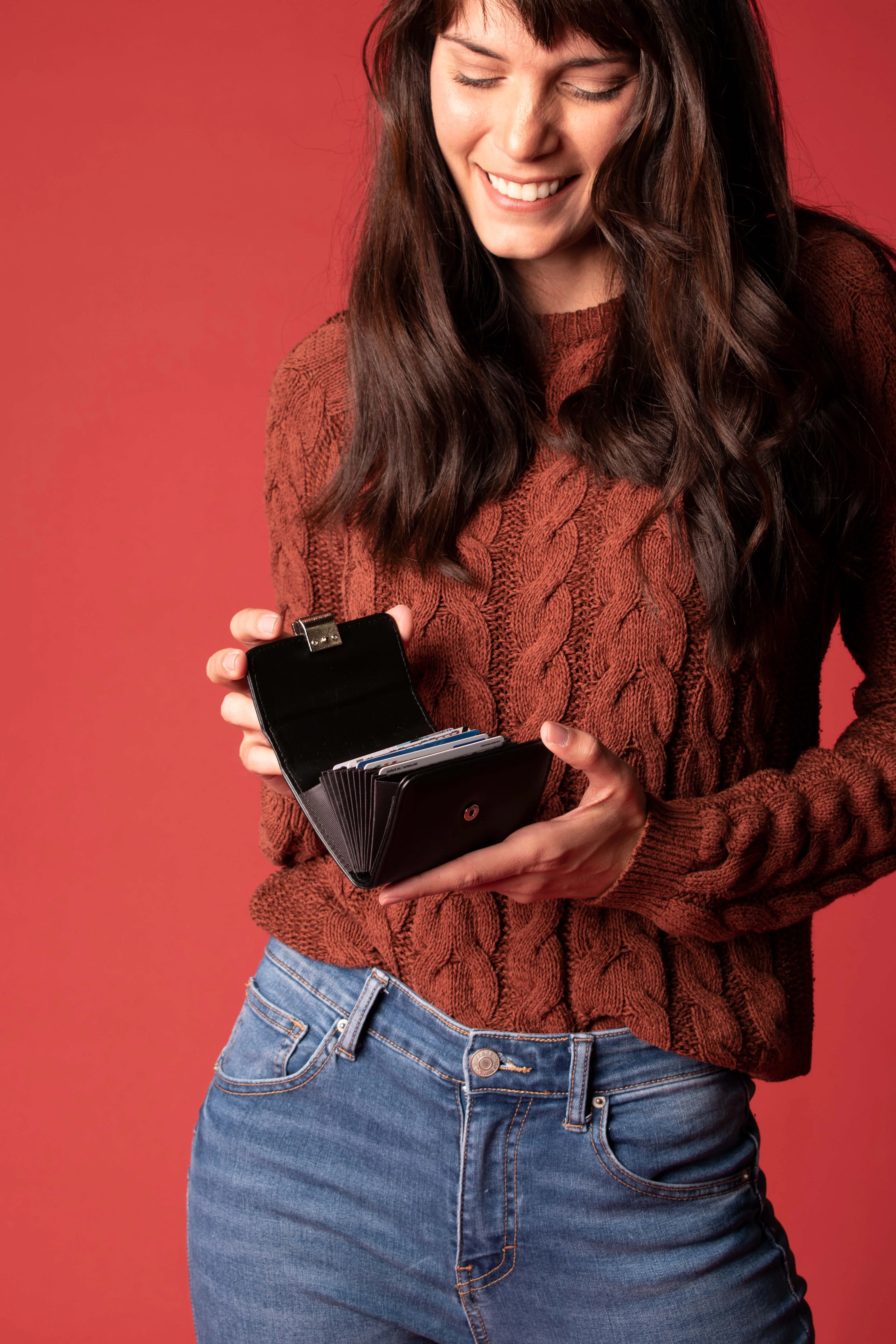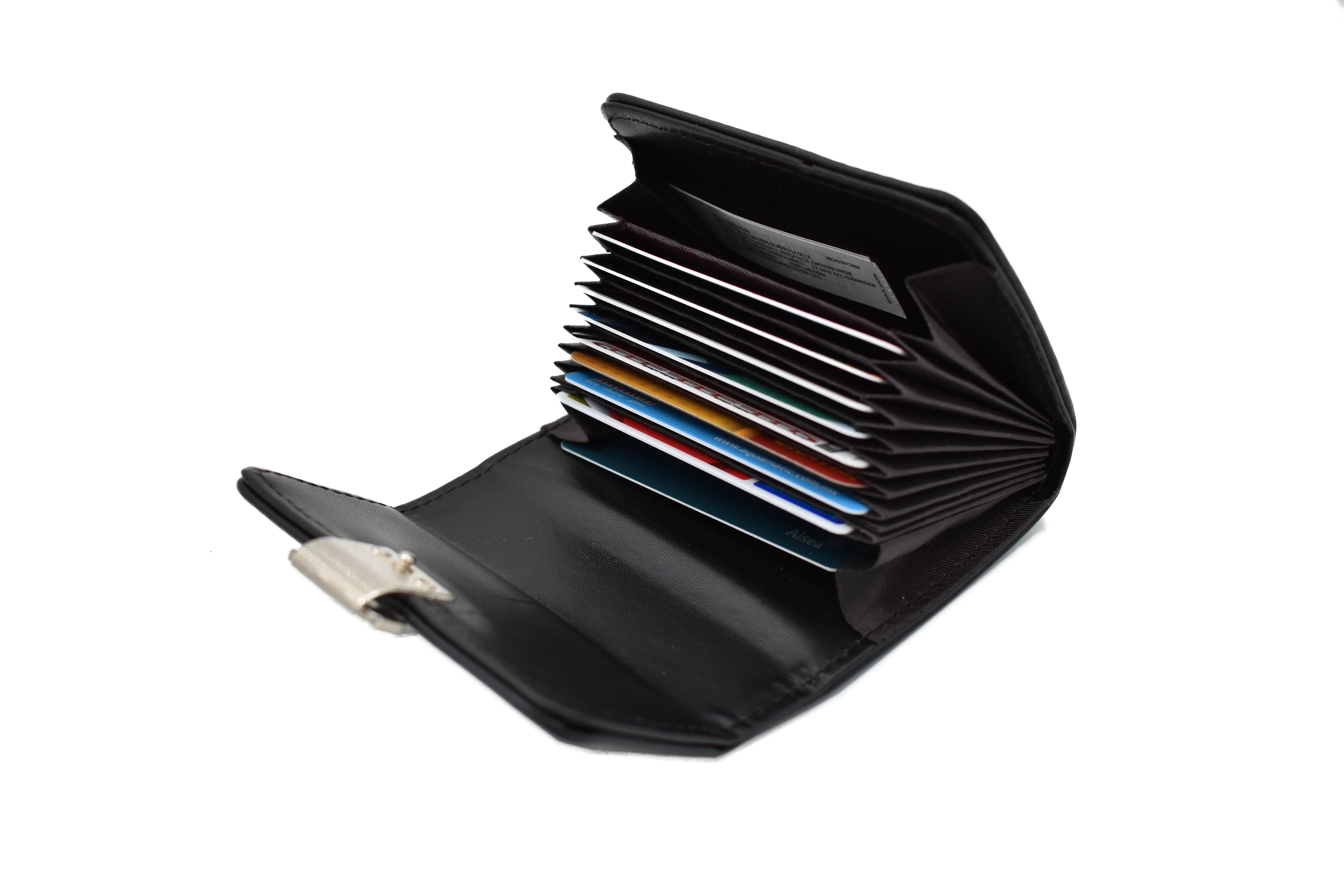 Tarjetero para mujer liso color negro, suave al tacto, cuenta con broche con detalles en orillas color plata. Es muy fácil de llevar, ligero y compacto. Color: Negro Color del cierre: Plata 11 Compartimentos para tarjetas Medidas: 8.5 cm alto x 11 cm largo x 3 cm ancho Composición: poliuretano. Forro: poliuretano Instrucciones de cuidado: Limpiar con paño seco.