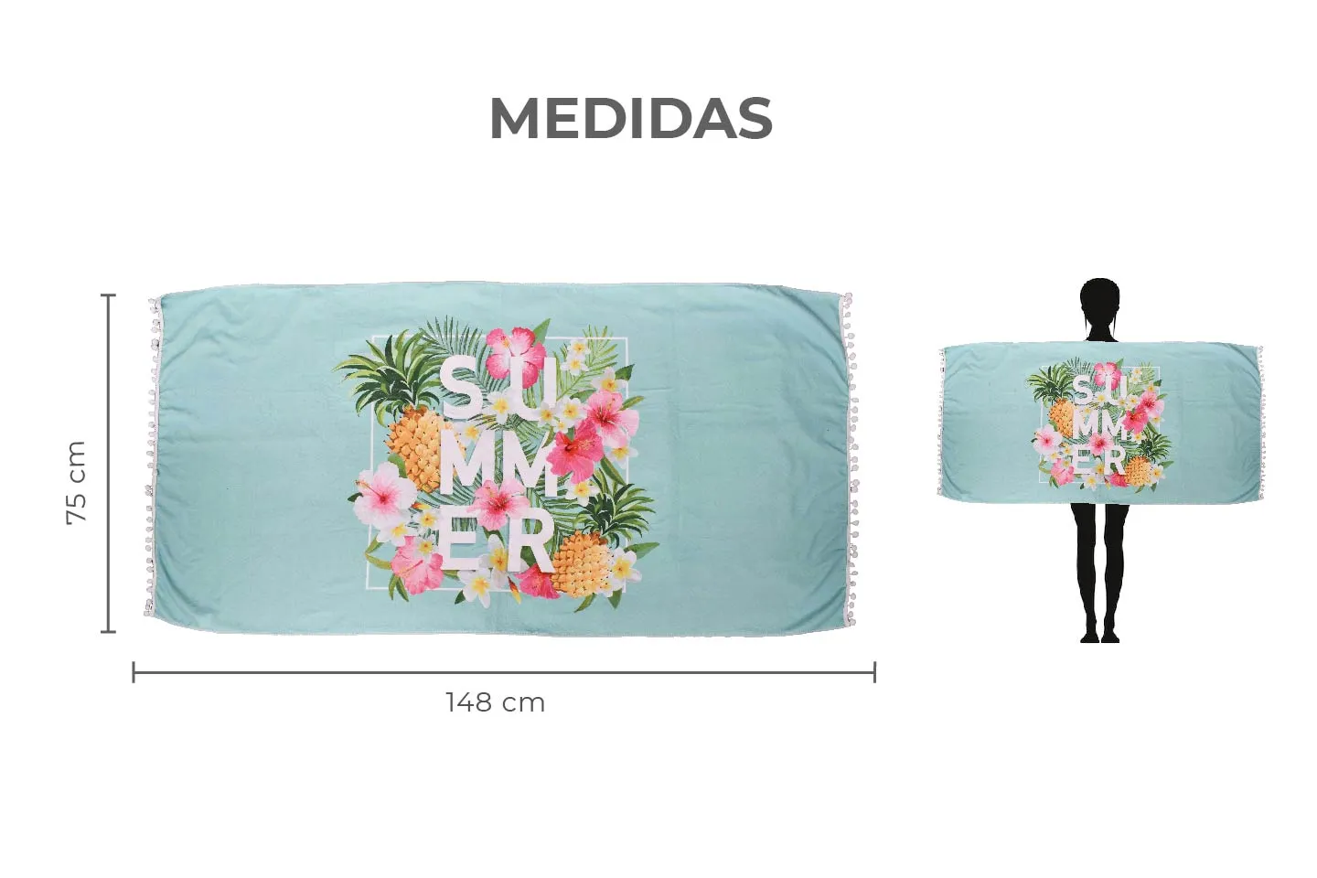 Toalla de playa multicolor, print summer, detalle de pompones en las orillas, ligera y suave, se pliega muy bien y es muy fácil de llevar. Diferentes usos como: toalla de playa, tolla de baño, manta de picnic, etc. Medidas: 75 cm alto x 148 cm largo Peso: 0.260 Composición: 100% poliéster Instrucciones de cuidado: Lavar a mano con agua tibia (30°), no exprimir, secar colgado a la sombra, no planchar.